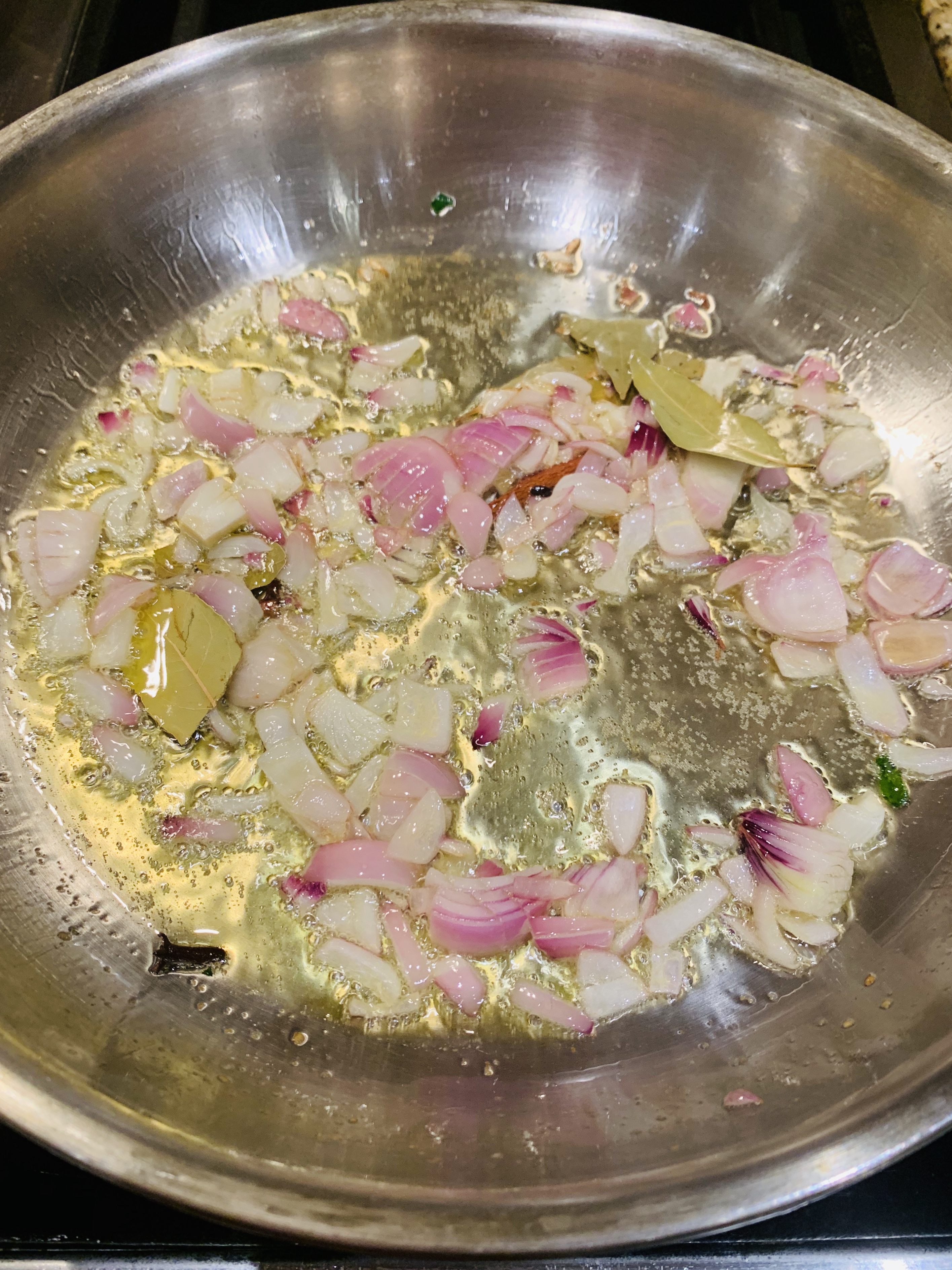 - In a heavy bottom pan, add 3 to 4 teaspoons of oil and 3 teaspoons of ghee. When the oil is warm enough, add 1 stick cinnamon, 3 to 4 cloves and 2 bayleaves. Sauté for few seconds until it leaves a good aroma. Now add 1 chopped onion and sauté until it becomes transparent. Add the ground onion-ginger-garlic-chilli paste to this and stir continuously until the oil separates from the pan. Add chopped tomato (1/2 tomato) and sauté until the tomato turns soft and mushy. At this stage, if the pan is too dry, add 1 to 2 teaspoon oil or ghee.