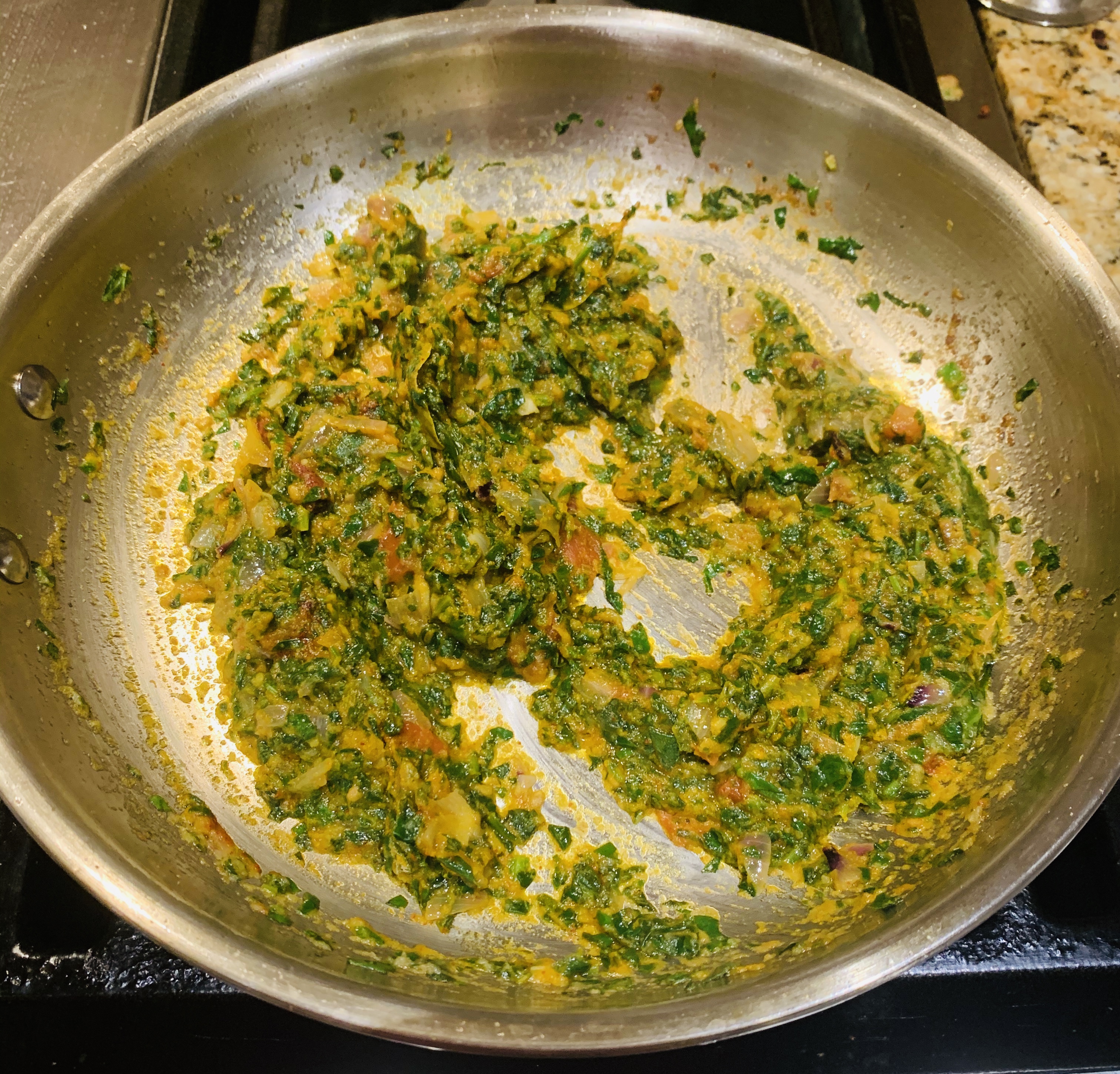 - Once the palak / spinach is cooked well, add 1 teaspoon turmeric powder, 1/2 teaspoon kashmiri chilli powder and 1/2 teaspoon channa masala. Reduce the heat to low and sauté for few seconds. Do not allow the masalas to get burnt.