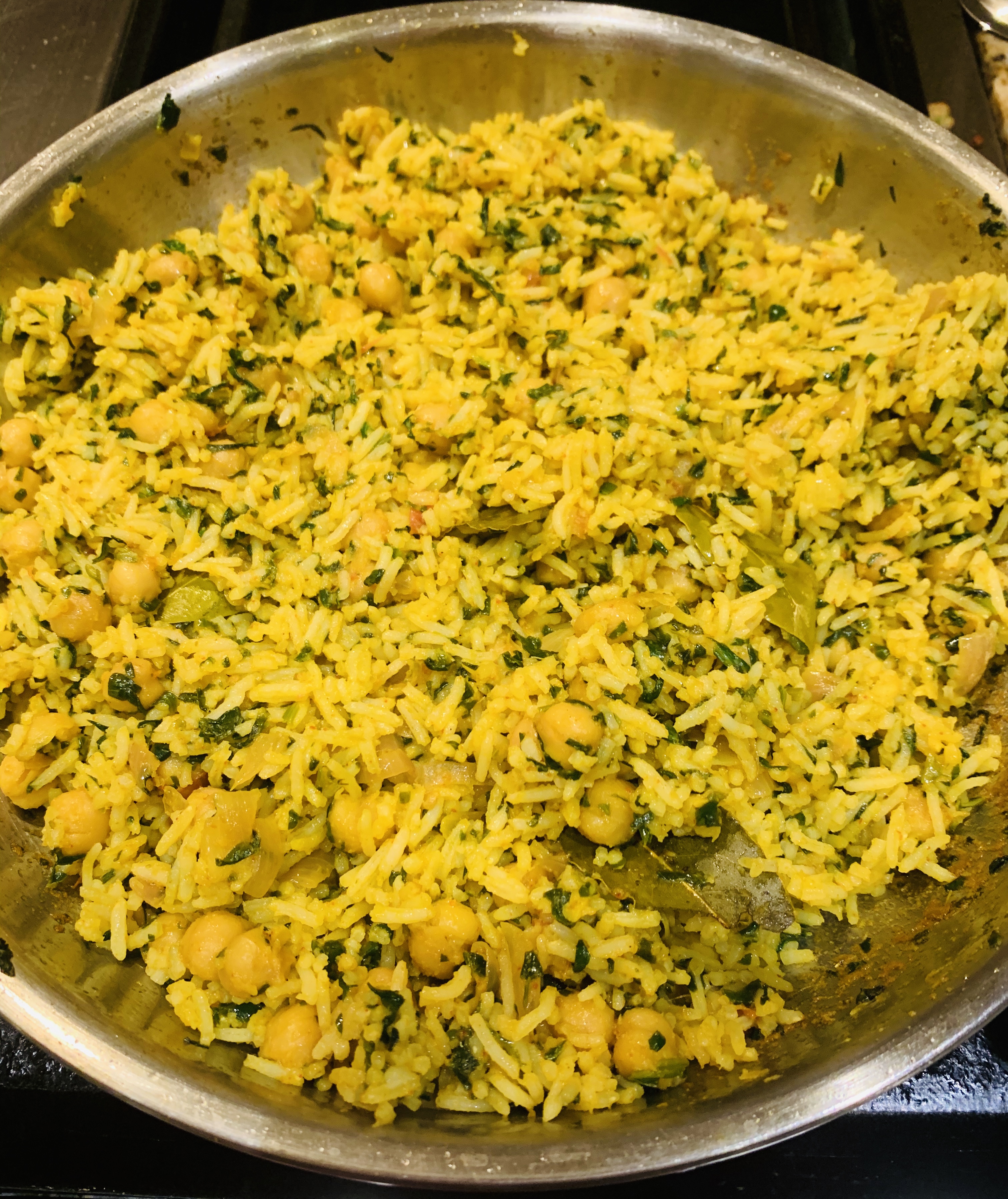 Palak Channa Pulav / Spinach Chickpea Pulav – a healthy, flavourful and nutritious meal perfect for lunch boxes and travel. Spinach is known for its rich nutrients and minerals. Chickpeas are a nutrient dense food packed with protein, dietary fibre, folate and other minerals. A combination of spinach and chickpeas along with rice makes it a one pot balanced meal. This flavourful pulav is prepared by tossing the cooked rice along with sautéed onions, tomatoes, spinach, pressure cooked chickpeas and few spice powders & masala paste. This palak channa pulav can be served with onion or cucumber raita.