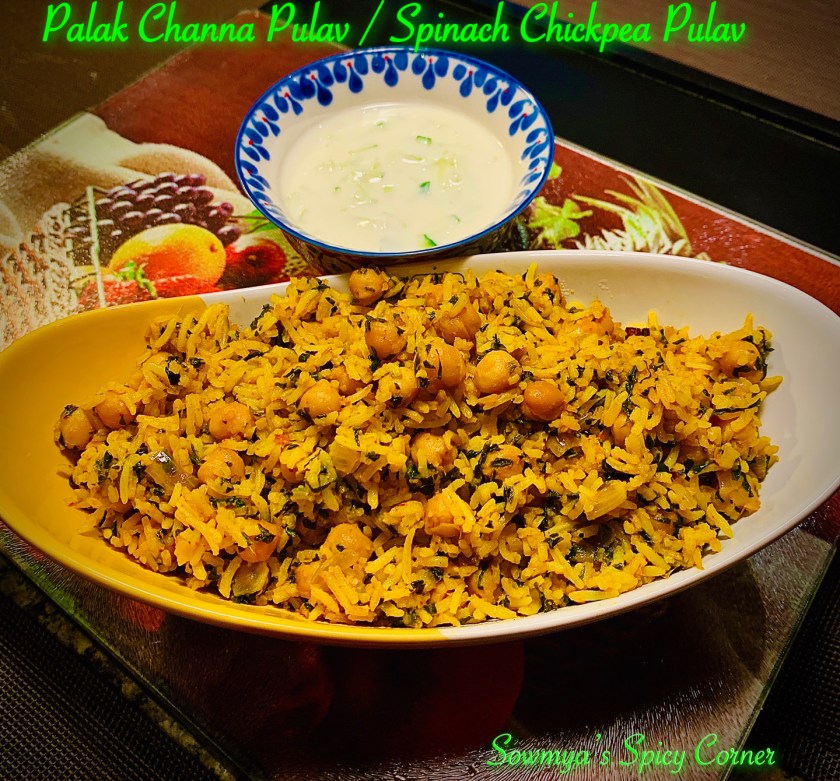 Palak Channa Pulav / Spinach Chickpea Pulav – a healthy, flavourful and nutritious meal perfect for lunch boxes and travel. Spinach is known for its rich nutrients and minerals. Chickpeas are a nutrient dense food packed with protein, dietary fibre, folate and other minerals. A combination of spinach and chickpeas along with rice makes it a one pot balanced meal. This flavourful pulav is prepared by tossing the cooked rice along with sautéed onions, tomatoes, spinach, pressure cooked chickpeas and few spice powders & masala paste. This palak channa pulav can be served with onion or cucumber raita.