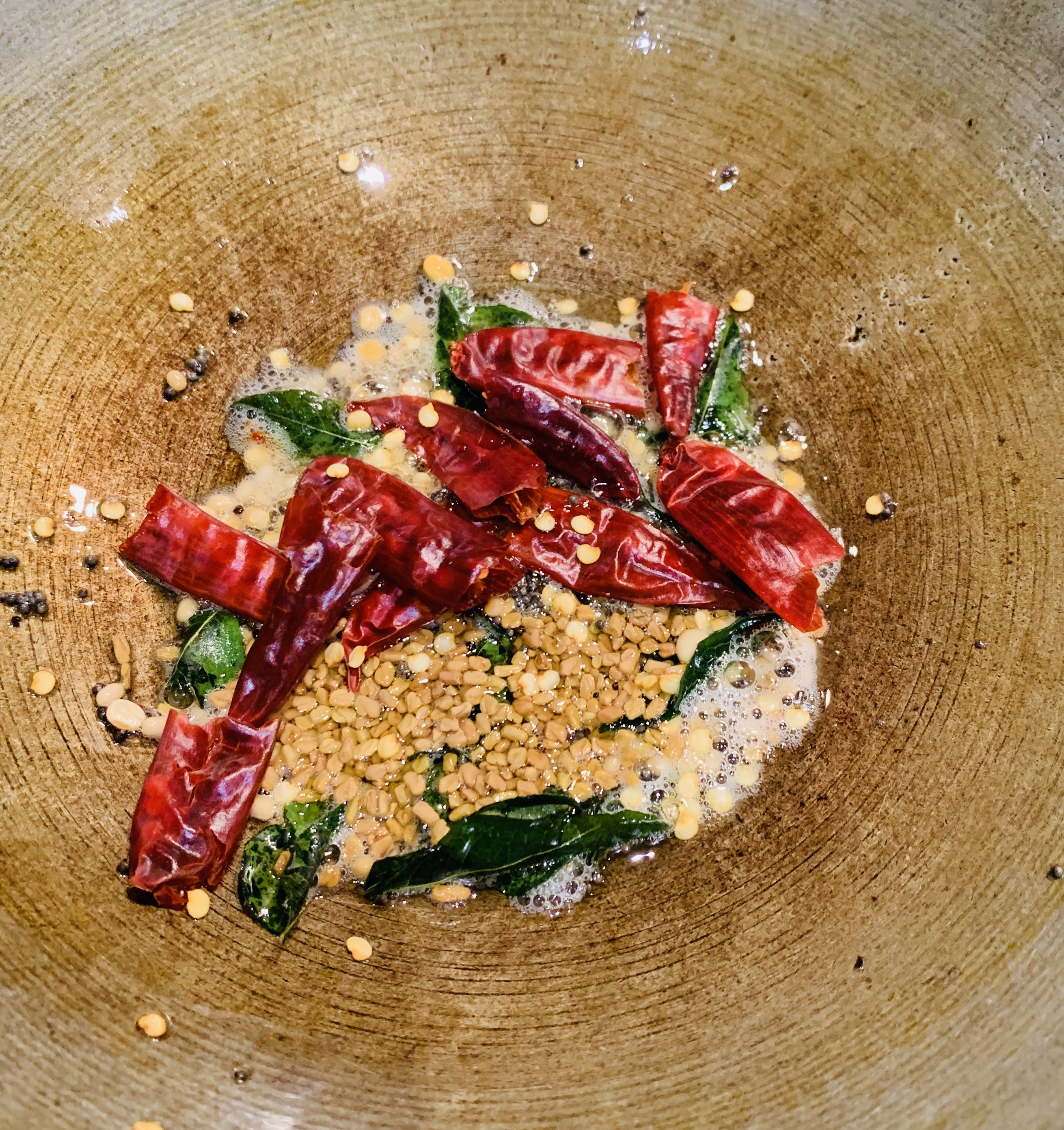 - With the heat on medium to low, add toor dhal, urad dhal and channa dhal. Sauté this for few seconds. When the lentils start to change colour, add the broken red chillies, vendayam /methi seeds and curry leaves. Add hing and turmeric powder. Do not roast for too long after adding methi seeds and red chillies. This entire process of roasting the lentils should be done in low flame so as to avoid charring of the ingredients.