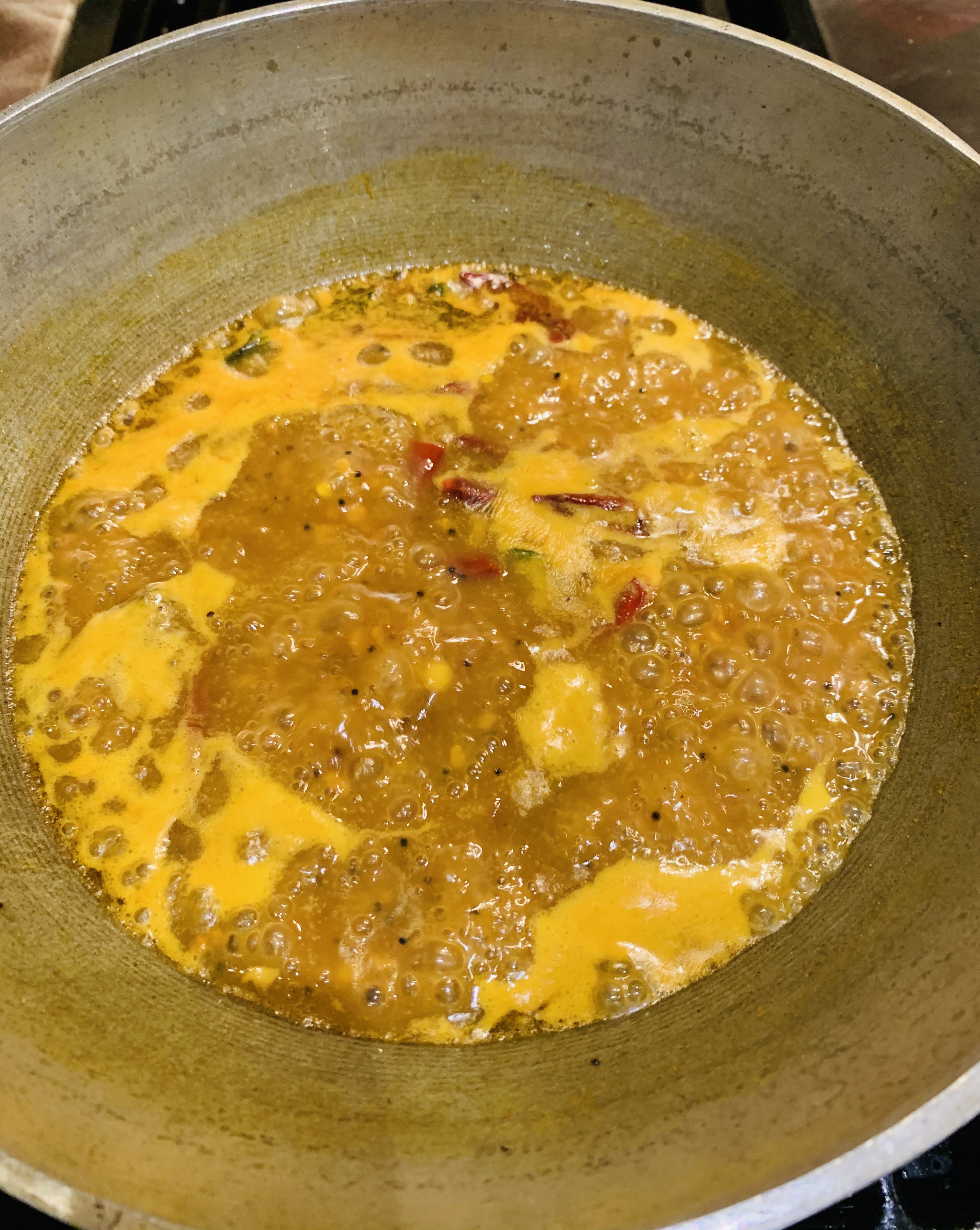 - Switch off the flame. For a final touch, add 2 sutta appalams/pappadams ( papadam cooked directly on fire) or fried papadams.