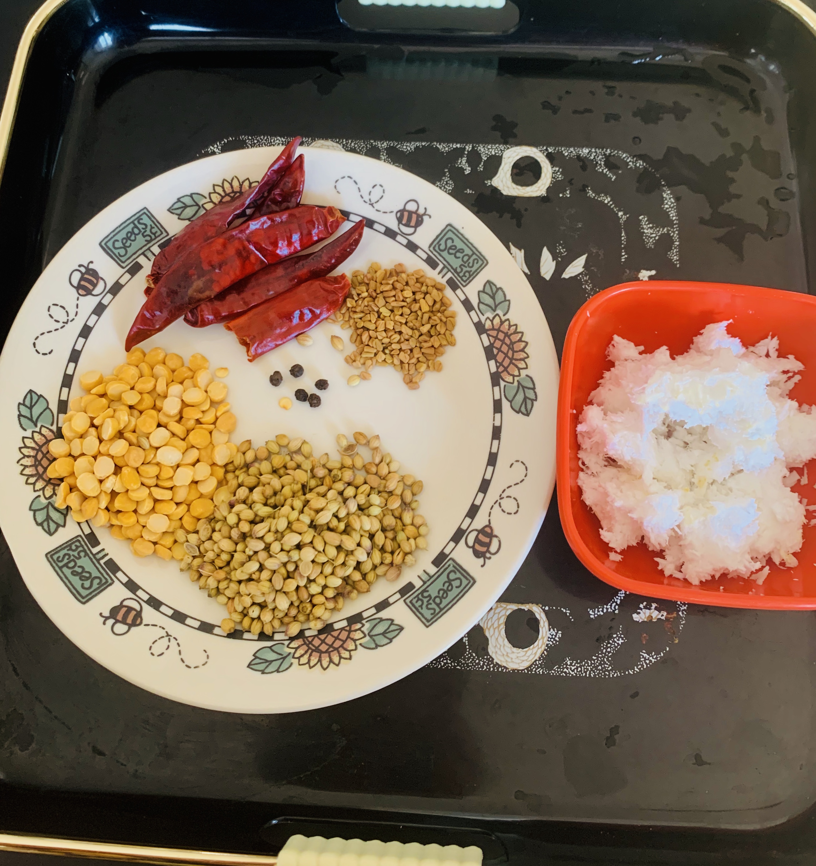- To prepare fresh sambar powder – In a kadai / wok, add 1 teaspoon oil, add channa dhal, coriander seeds and peppercorns. Keep the flame low. Keep stirring the contents until the channa dhal starts to change colour. Now add red chillies and methi seeds/ vendayam. Stir for few seconds until the channa dhal turns golden yellow colour. Now add the shredded coconut and switch off the flame. Stir until the coconut slightly gets sautéed in the residual heat. Transfer the contents to a plate and let it cool. Transfer the roasted lentils and spices to a blender. Grind this to a fine powder.
