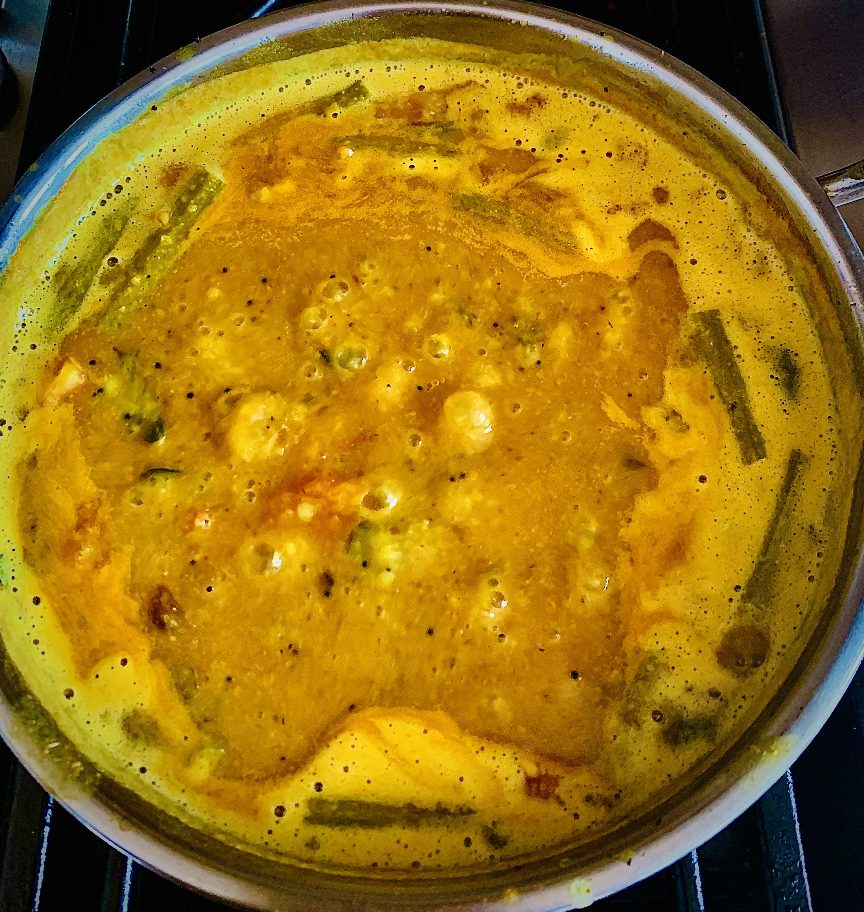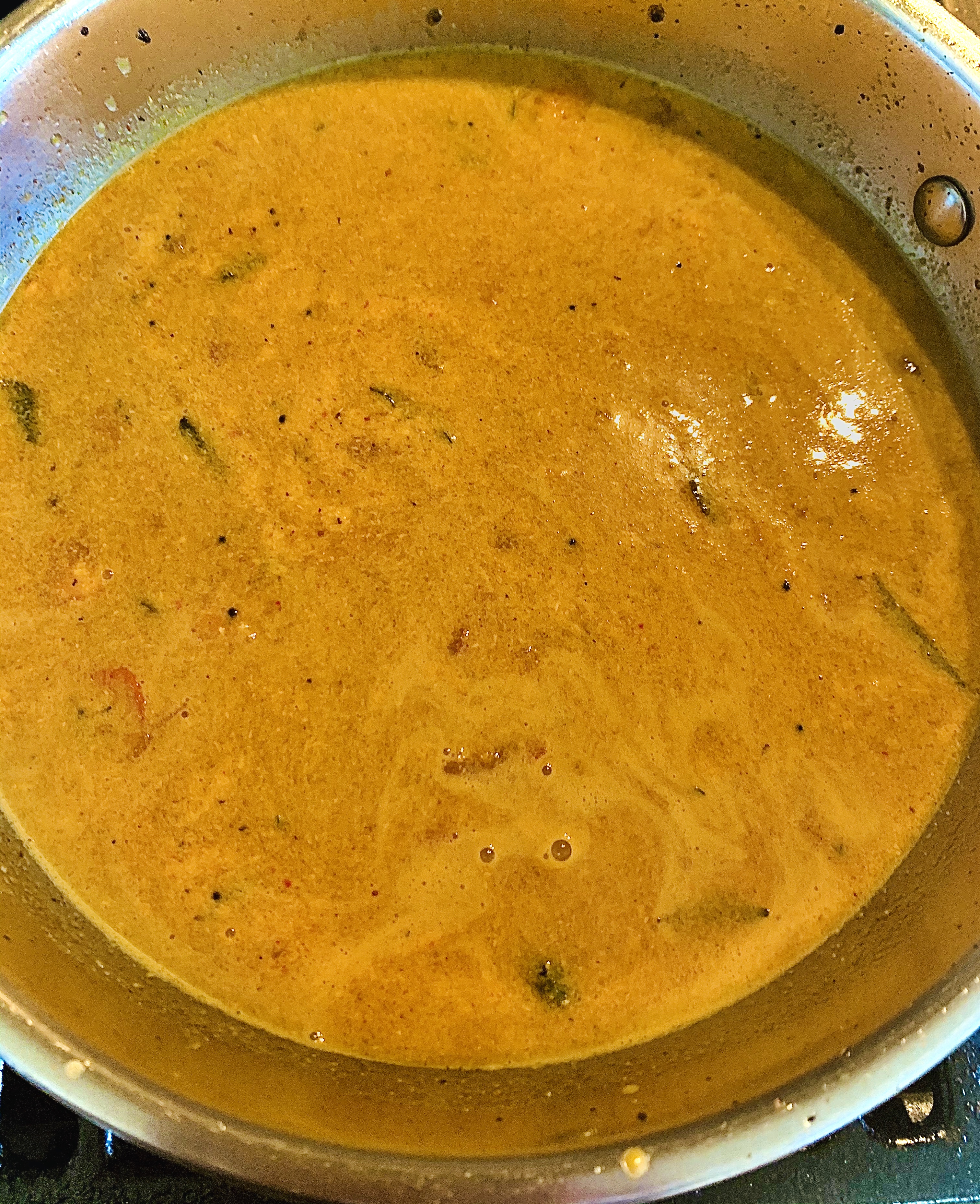 - Now add the already pressure cooked and mashed toor dhal. Let it cook for about 5 to 7 minutes until the sambar thickens.
