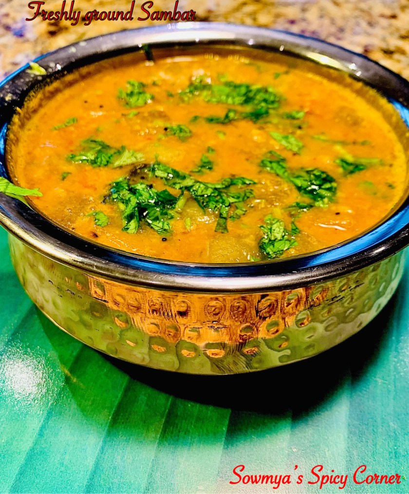 - Add the freshly ground sambar powder and mix well. Let it cook for about 5 to 7 minutes or cook until the raw flavours of the spices go away.
