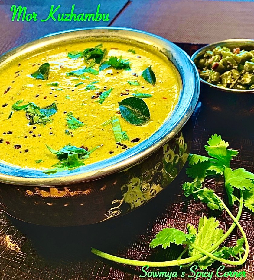 - In a pan, add 2 teaspoon of coconut oil, add mustard seeds. When the mustard seeds crackle, add jeera and curry leaves. Add this tempering to the more kuzhambu. Garnish with finely chopped coriander leaves.