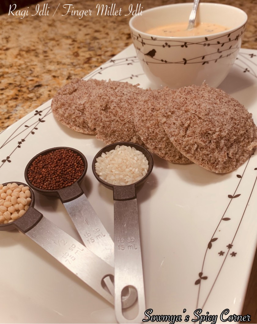 Ragi or Finger millet is one of the most nutritious gluten-free cereal grain. Traditionally in South India, it is taken in the form kanji or koozh /porridge along with milk. Despite the fact that it is highly nutritious, it is a long forgotten grain like the other millet varieties. With more and more people becoming health conscious, this grain is gaining popularity. Substituting a portion of white rice by this nutrient rich millet in idli/dosa batter is a good and smart way for healthy eating. The color of the idlis may not be appealing to the eyes, but definitely the taste is not compromised.