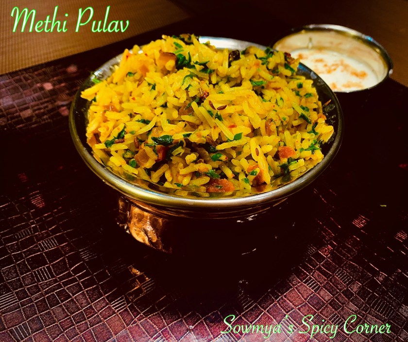 Methi Pulav is a nutritious and flavourful one pot meal, perfect for travel and lunch boxes. The methi leaves or fenugreek leaves are a powerhouse of nutrition since they are rich in iron, Vitamin C, A and other minerals. It has myriad of health benefits, including regulation of blood sugar and cholesterol. Methi leaves have a slight bitter taste which can be over powered by adding the right amount of spices & following few tricks and tips. There are several ways to include this nutritious methi leaves in the diet (Methi paratha, Methi adai, Methi millet adai/dosa, Methi raita, Methi Kootu, Methi masiyal, Methi sambar& much more) . Today’s recipe, Methi pulav is prepared by tossing the cooked rice along with methi masala paste and some spices. Stay tuned to this blog space for more healthy methi recipes in future.
