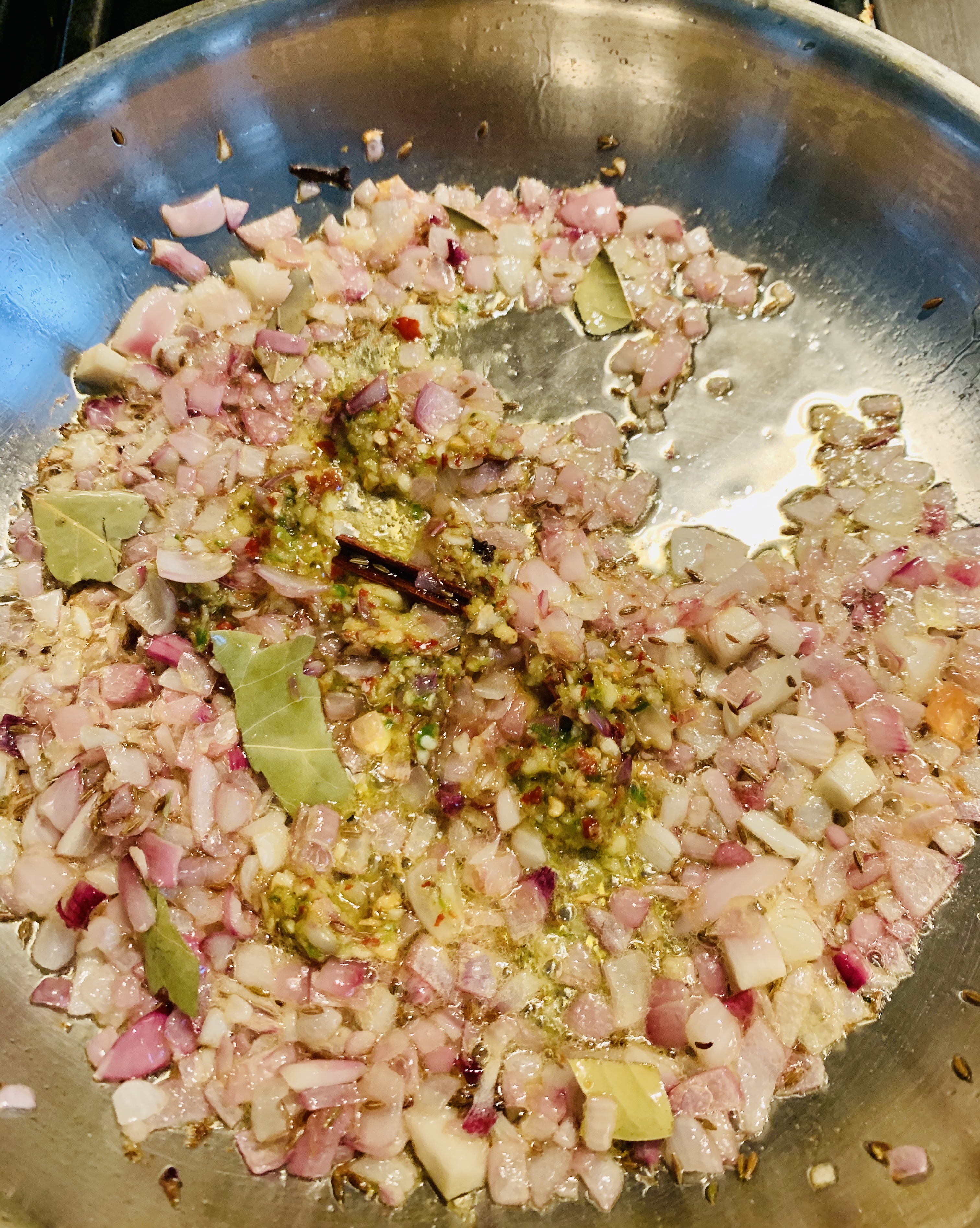 - Add chopped onions and stir every now and then. Once the onions become transparent, add the ground paste and sauté until the raw flavour goes away.