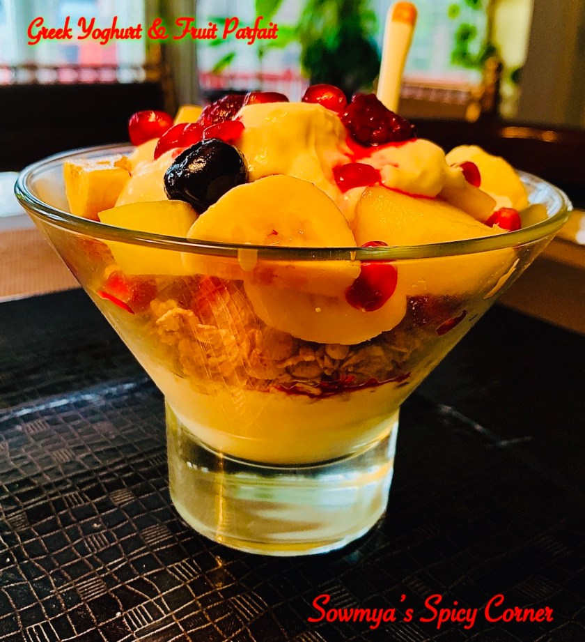 Greek yoghurt & fruit parfait is a healthy and delicious breakfast to start your day. Parfait is a French-style dessert made by layering whipped creme, ice-cream and fruits. Nowadays in restaurants and cafe, it is served as healthy breakfast by substituting the creme by plain yoghurt or greek style yoghurt. It is easily prepared in minutes by layering the greek yoghurt, fruits and granola in layers in a clear transparent glass cup. The addition of smooth and creamy yoghurt, crunchy granola and the fresh fruits impart different textures, refreshing flavours and taste.