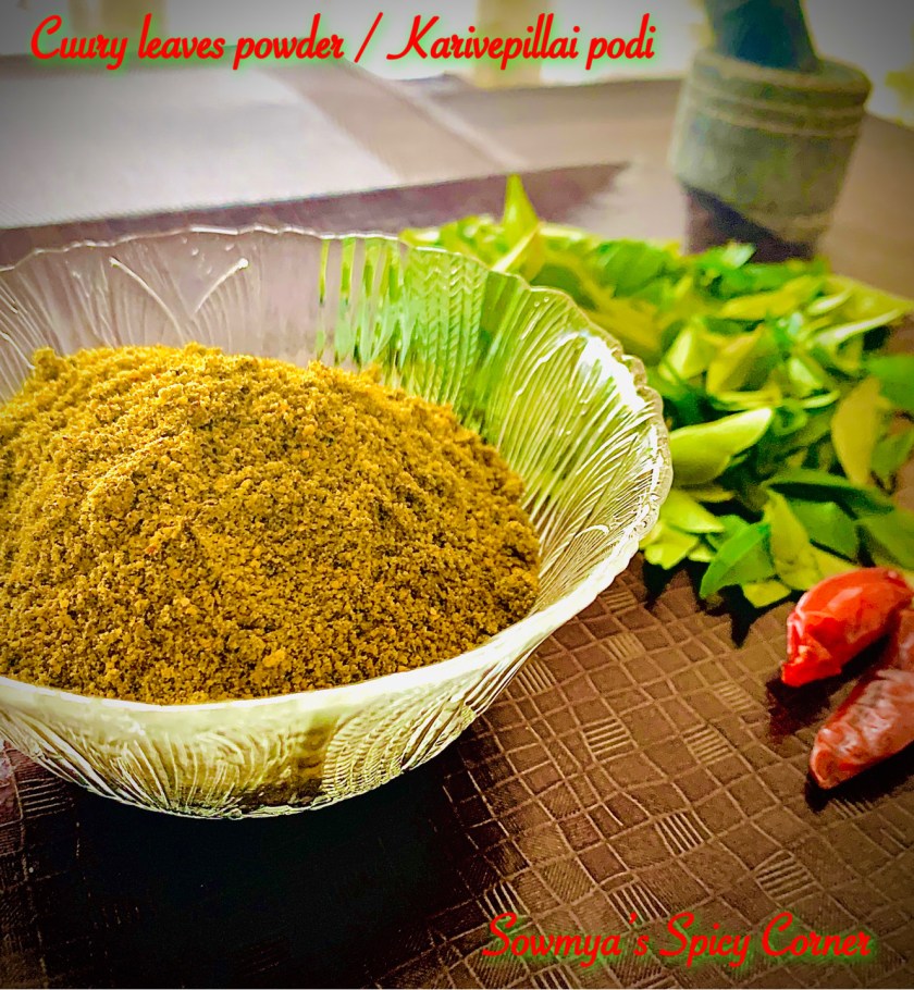 Curry leaves are an essential ingredient in all South Indian dishes because of its aromatic and unique flavour. Apart from its aromatic flavour, they are well known for medicinal value. Most of the South Indian dishes are garnished with sprigs of curry leaves along with coriander leaves. But they are often hand picked and neglected while serving/ dining because of its bitter taste. Unlike the raw curry leaves, the curry leaves powder tastes delicious and can be served with steamed ghee rice, or as an accompaniment to idli or dosa. The bitterness and raw flavour of curry leaves are altered / masked by roasting and powdering it along with few other lentils and spices. Roasting and powdering this way also increases the shelf life of the curry leaves powder.