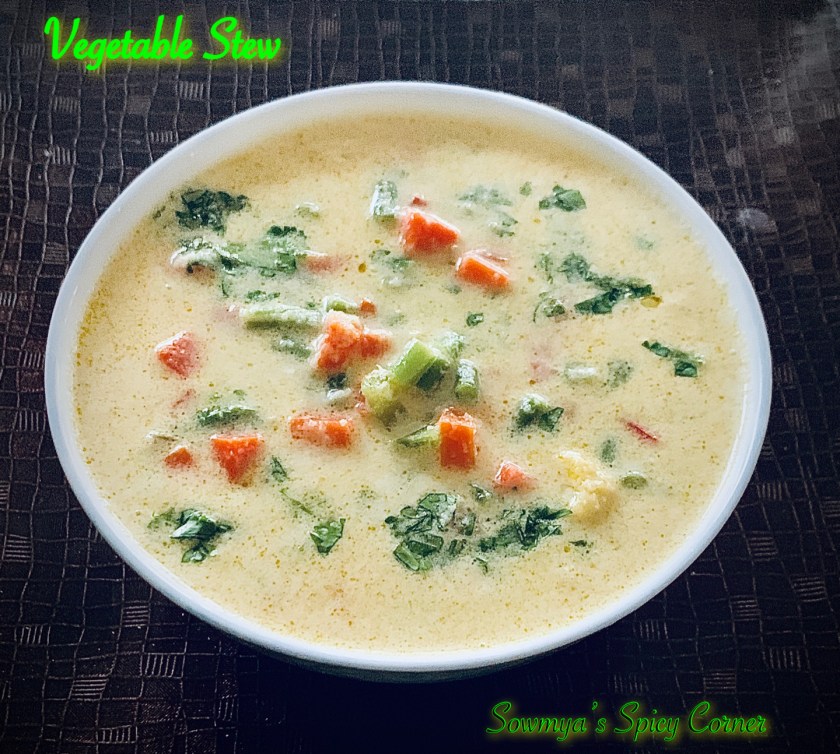 Vegetable stew is a quintessential Kerala dish that pairs well with Appam / Idiyappam. It is a creamy, delicately spiced coconut based gravy. It is a simple dish and tastes very different from the traditional South/North Indian Korma. This mildly spiced vegetable stew is prepared by simmering some assorted vegetables along with few spices in coconut milk. The addition of coconut milk gives a light creamy silky texture perfect to soothe and satiate your palates.