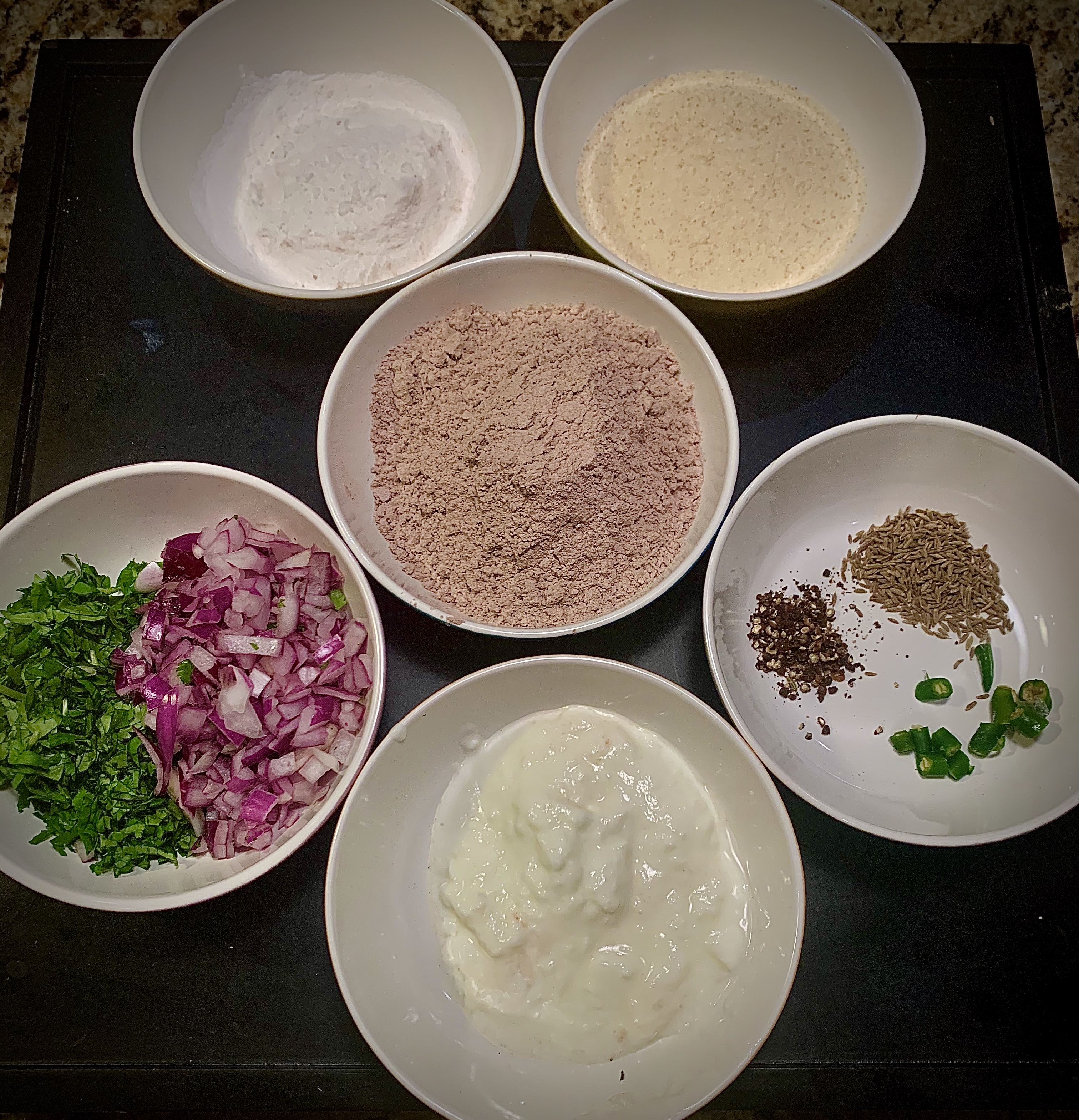 - Add yoghurt, salt, chopped coriander, chopped onions, chopped green chillies, pepper, cumin seeds and salt.