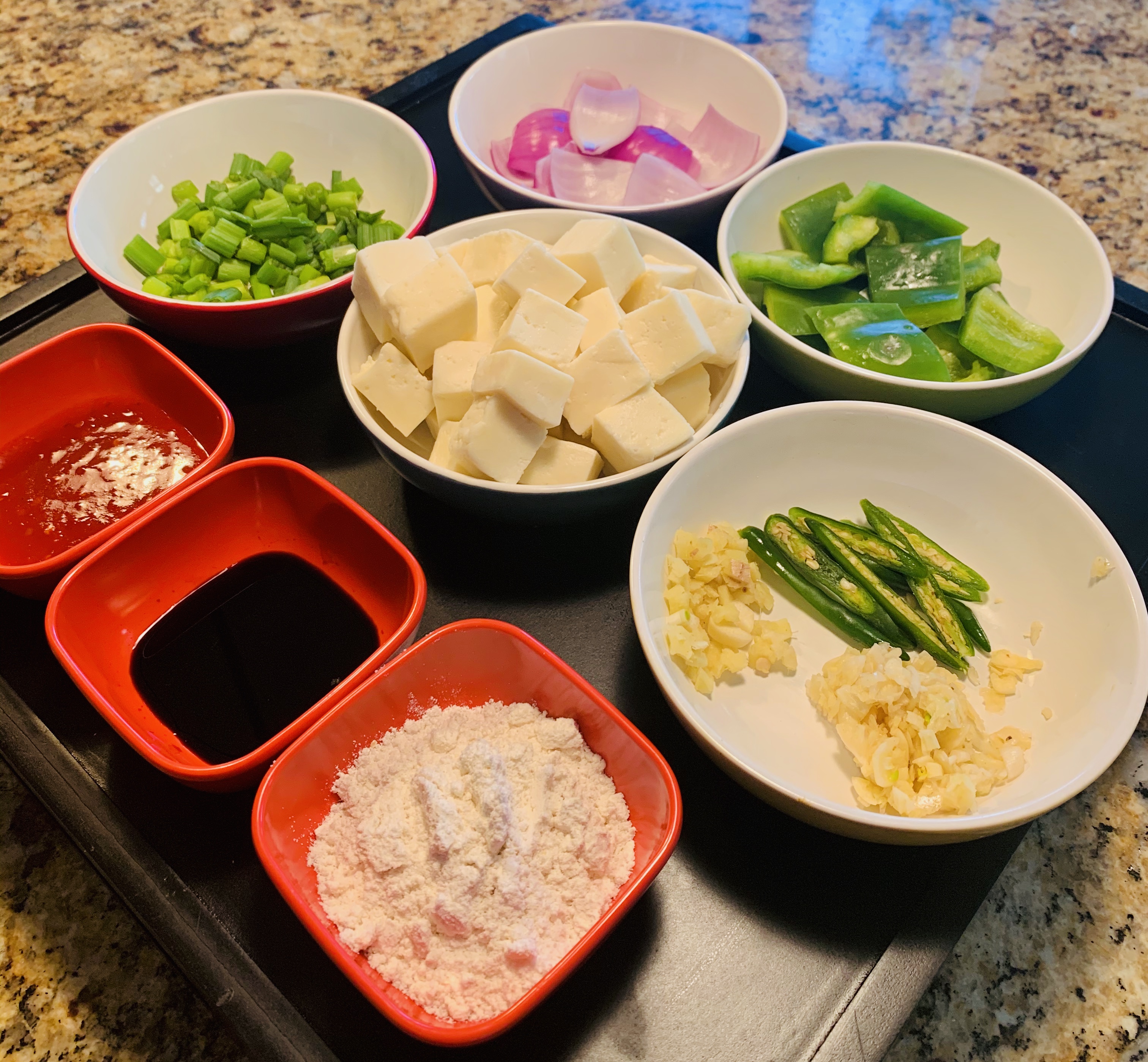 - Chop the bell pepper and onion into square shaped slices. Finely chop the spring onion.