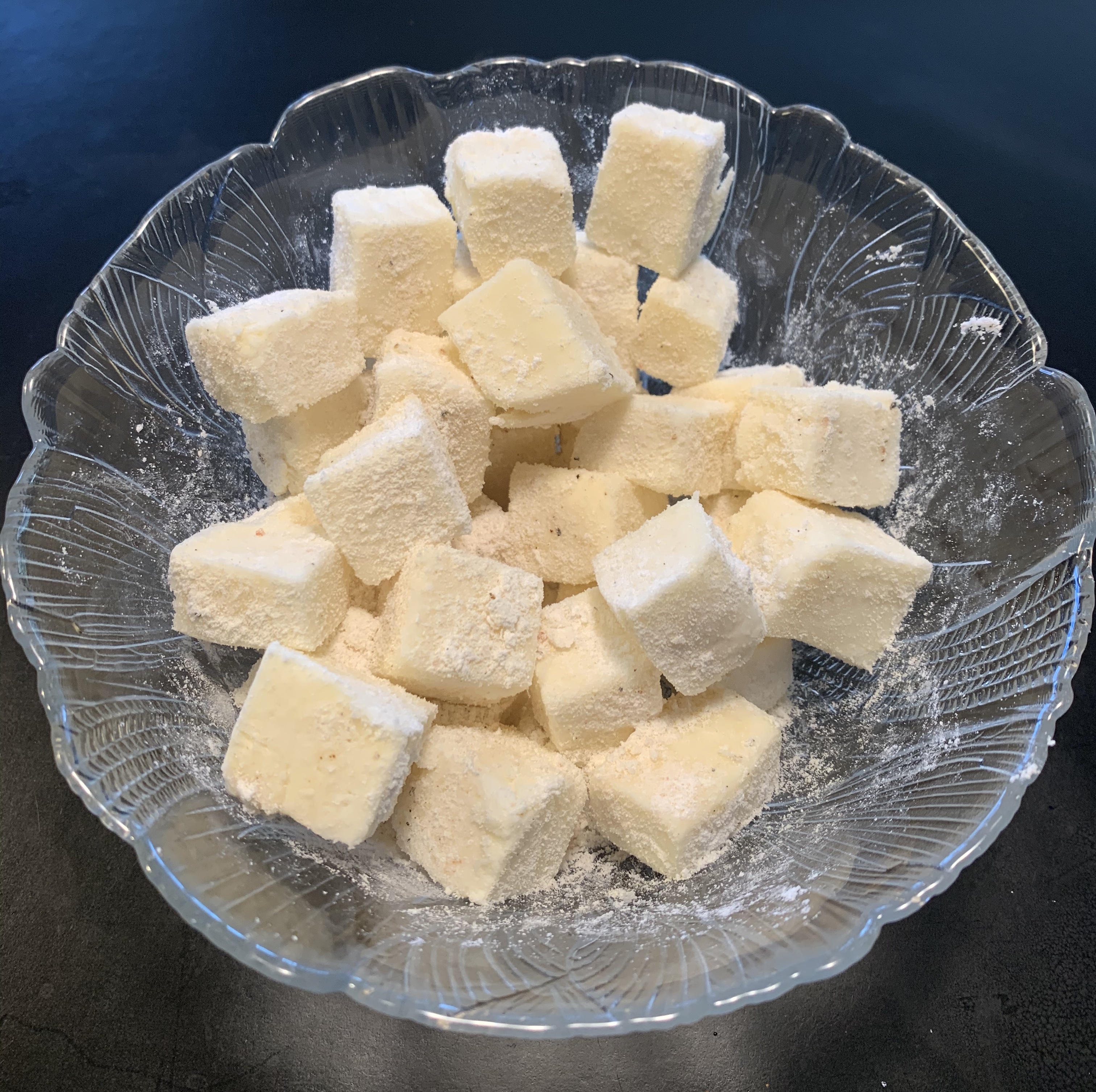 - Now add 11/2 to 2 table spoon of corn flour to this. Mix thoroughly so that all the paneer cubes are coated with the corn flour. This is a dry mixture.
