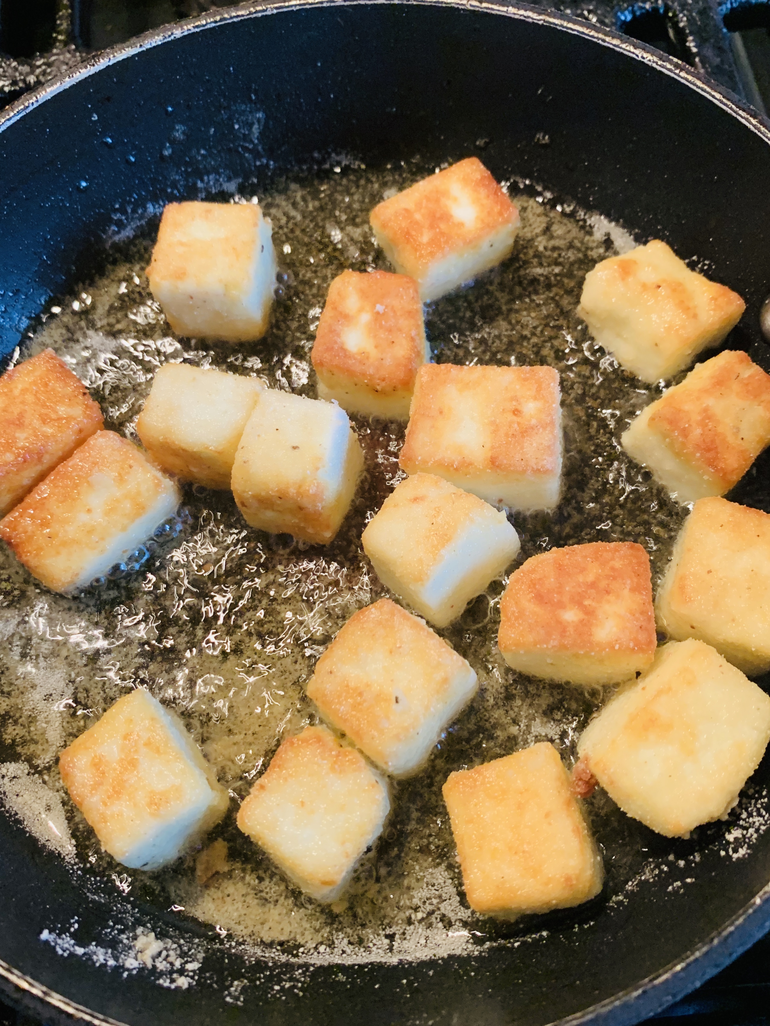 - To shallow fry the paneer – In a pan, add about 5 tablespoon of oil. When it is warm enough, add the paneer cubes and shallow fry in medium flame. Do the frying in small batches. Fry the paneer until it is light brown in colour. Do not fry the paneer for too long as this will harden the paneer. Dry the fried paneer on a tissue paper to drain the excess oil.