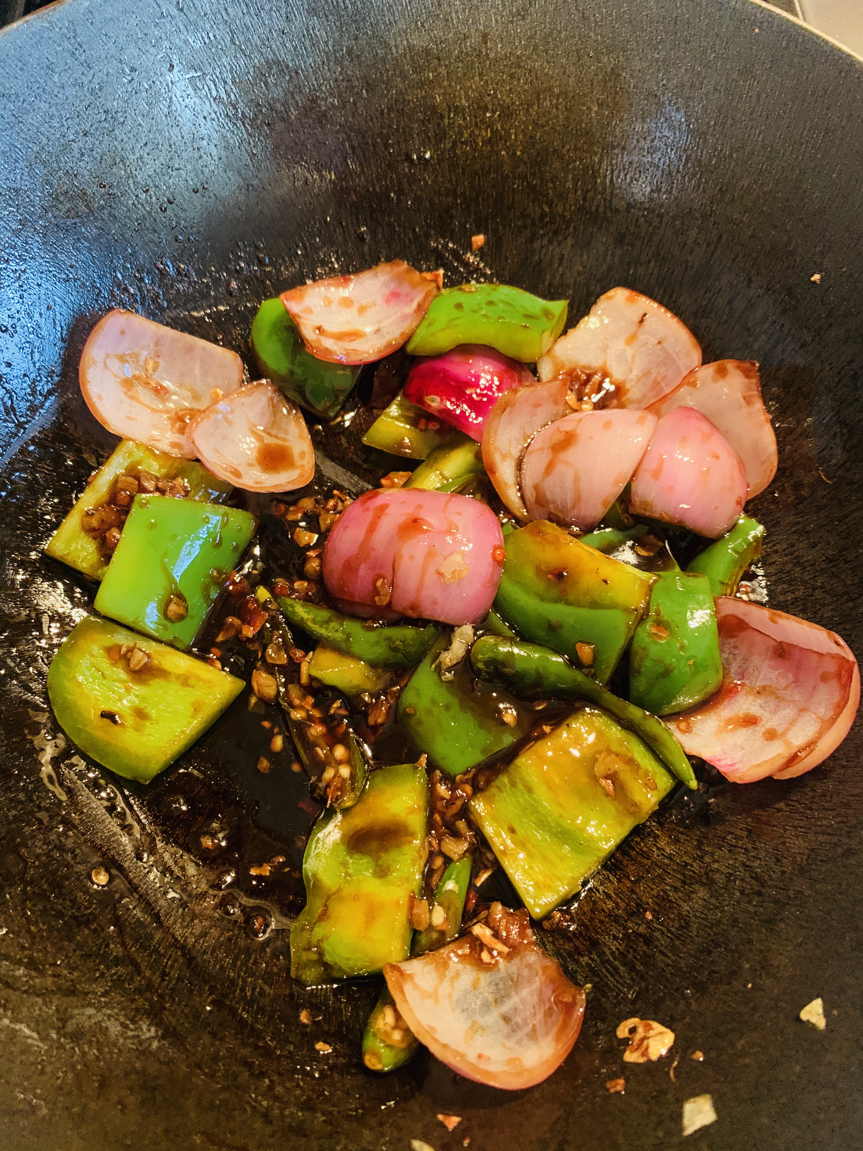- Add the sliced bell pepper and stir fry for a minute or so.