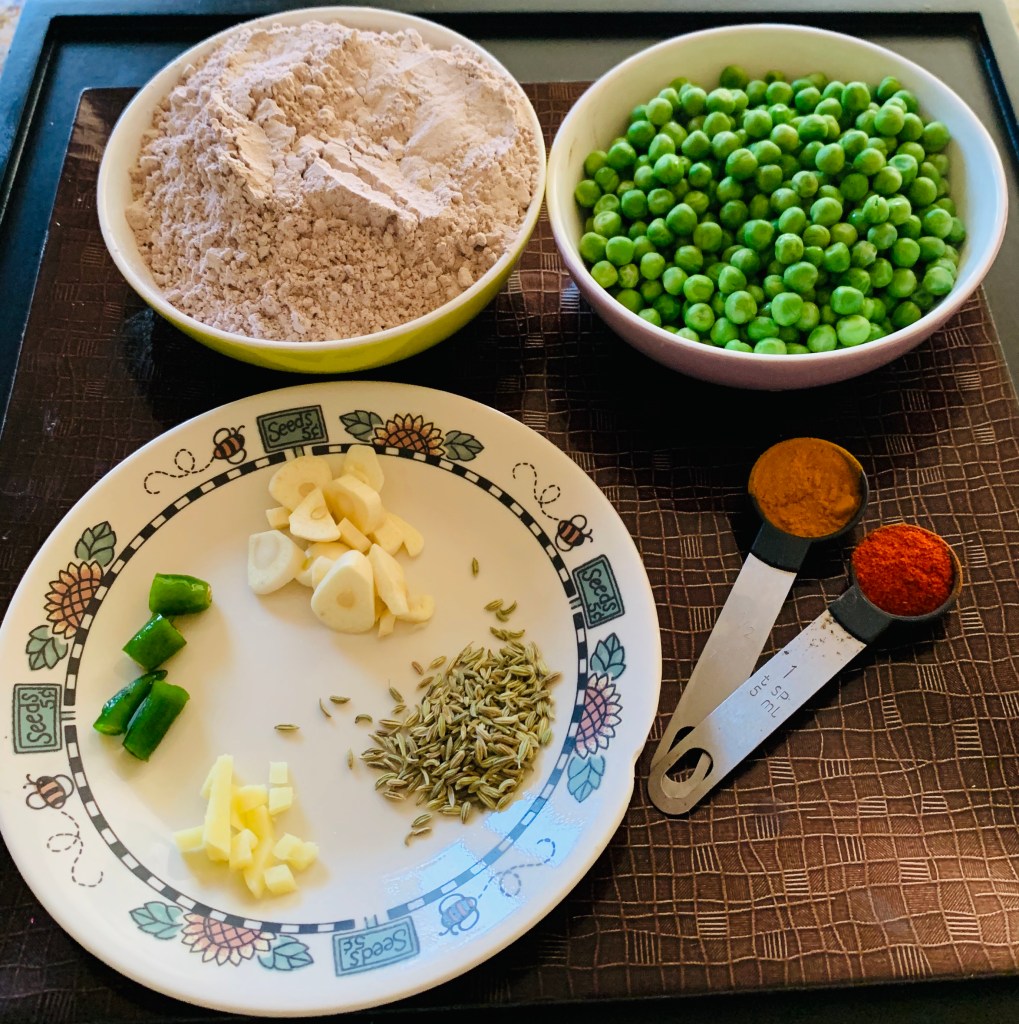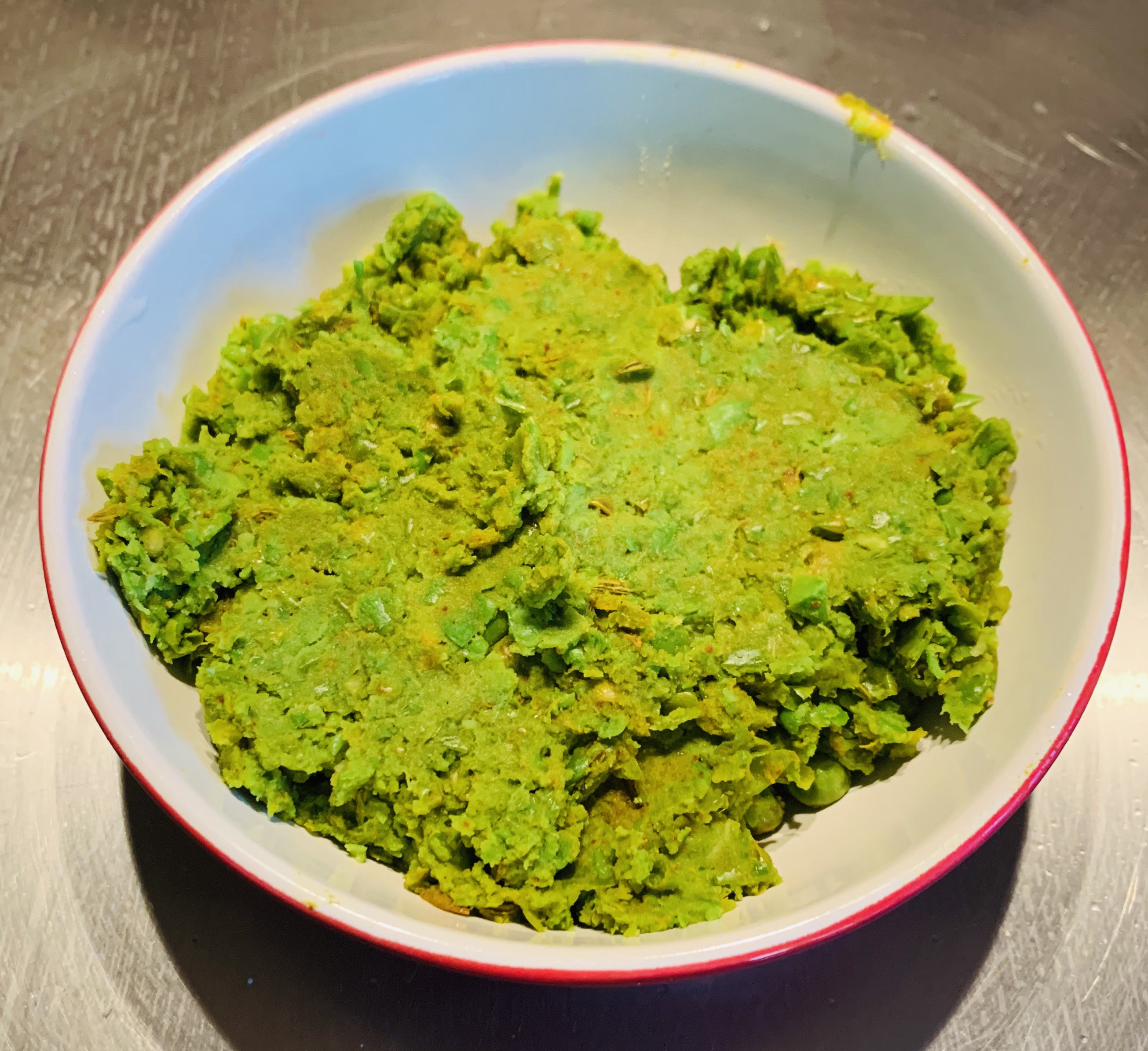 - For stuffing – Take 2 cups of frozen peas and boil it in water. Drain the water. Take a pan, add 2 teaspoon oil. When the oil is warm enough, add 1 teaspoon fennel seeds, 1 slit green chilli, minced garlic and ginger. Sauté until the raw smell goes off. Add the boiled peas to this, add salt, 1/2 teaspoon turmeric powder and 1/2 teaspoon kashmiri chilli powder. Stir the contents for about 1 minute or so until there is no moisture. Allow this to cool. Transfer the contents to a mixer / blender and give a pulse. Just grind it to form a coarse paste.