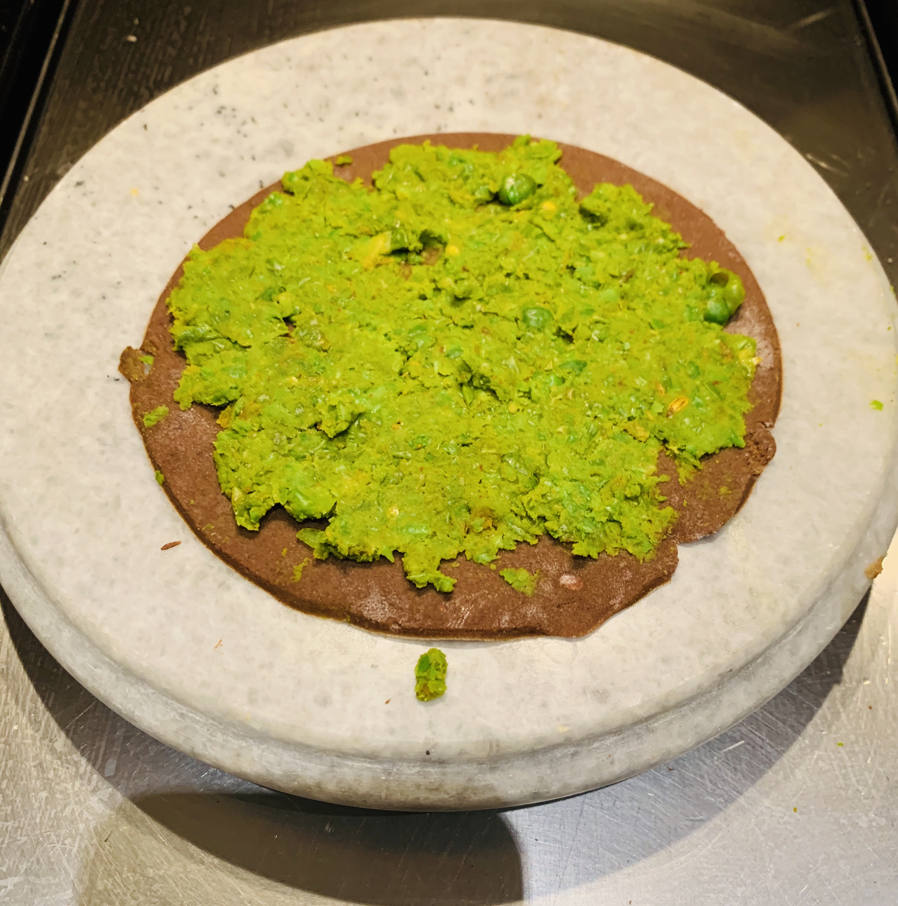 - To make paratha – Take 1 rolled ragi roti. Using a spoon place about 2 teaspoons of the peas stuffing and spread it on one side. See that the stuffing is evenly distributed. Place another rolled ragi chappathi on top of this. Close the edges by pressing the fingers along the corner. Press gently in the middle so that the stuffing gets distributed evenly. Heat a tawa, place the stuffed ragi roti / paratha on the tawa and cook for few seconds. Flip over so that both sides are cooked evenly. Drizzle some oil or ghee on top.
