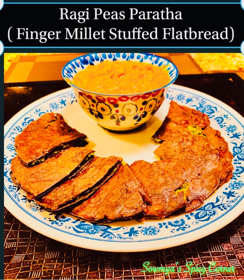 Ragi Peas Paratha – a healthy, gluten-free Indian flatbread made from ragi flour/finger millet, stuffed with boiled peas, ginger, garlic and few other spices. Ragi / Finger millet is a diabetic friendly whole grain and is packed with essential nutrients like Vitamin C, E, B- complex, iron and calcium. This gluten-free grain is known for its rich fibre content and hence is an excellent substitute to the regular cereals and grains such as rice, wheat and barley. Ragi flour as such has a rustic and earthy taste and hence stuffing it with masala peas balances the texture, flavour and taste. Serve this ragi peas paratha with a cup of yoghurt / tadka dhal / subzi.