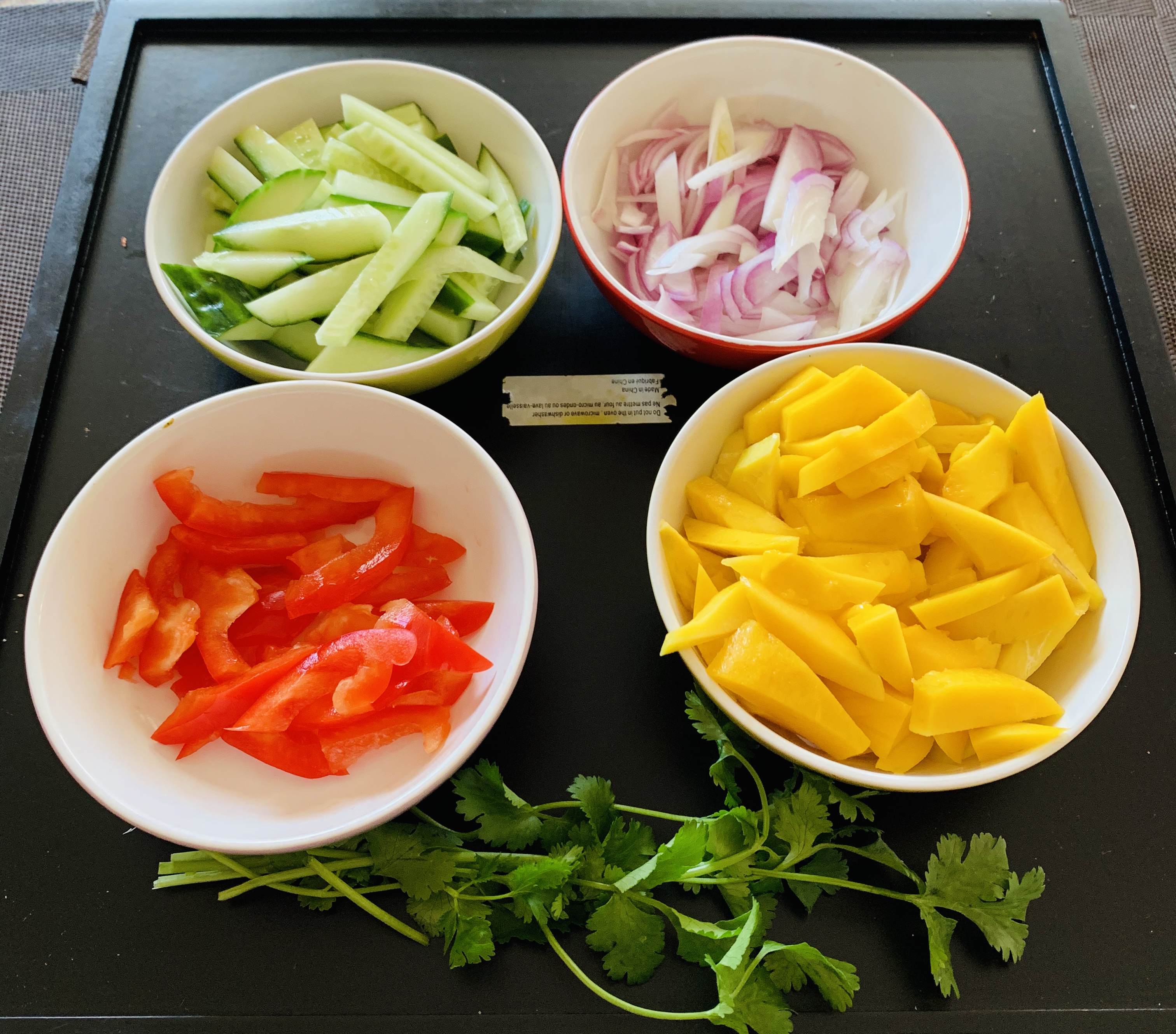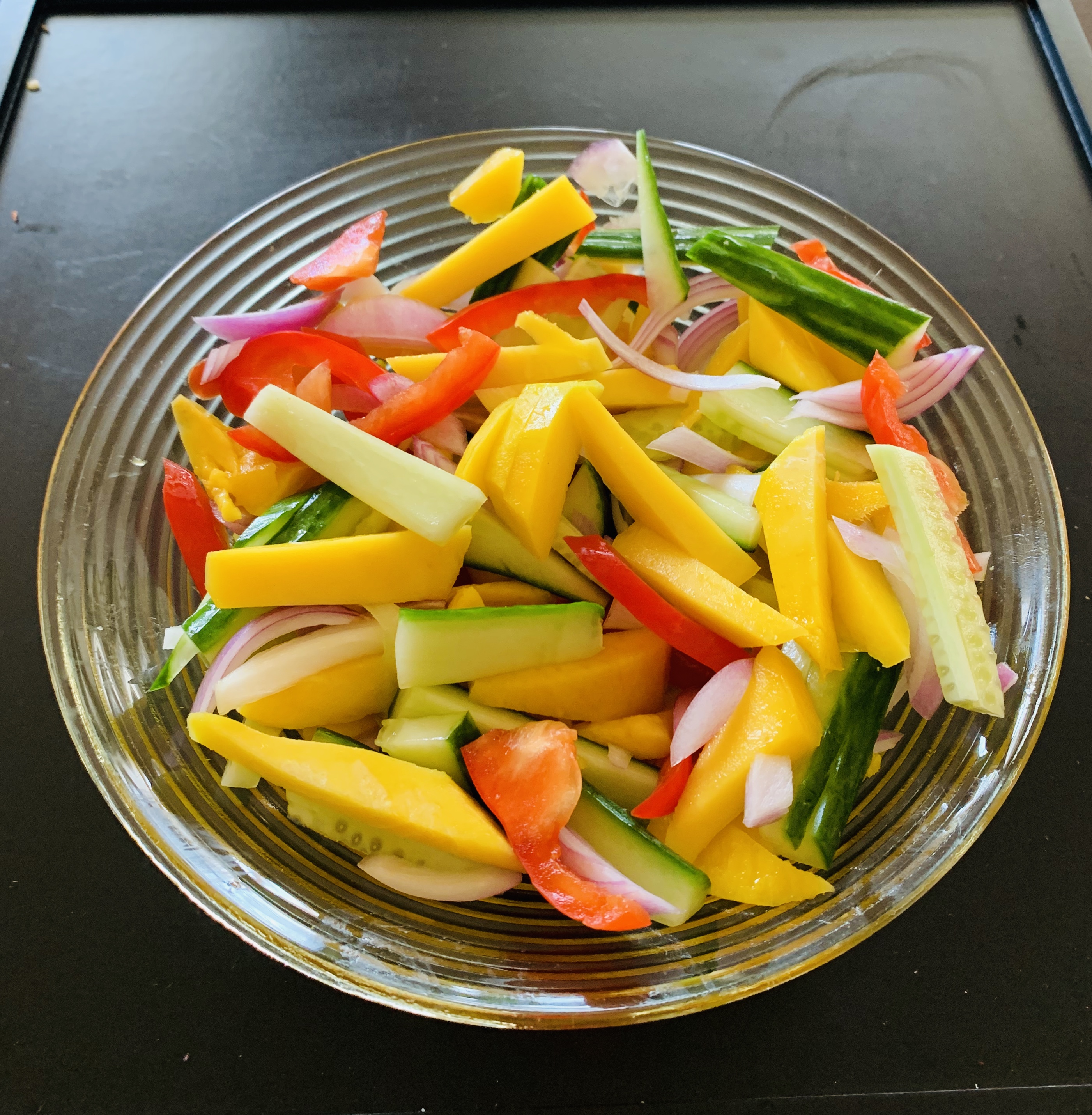 - Peel the skin of the mango and thinly slice the mango lengthwise. Slice the cucumber, red onion and red bell pepper lengthwise and place it a salad bowl. Finely chop the coriander leaves and add it to the bowl. Add salt and mix well.
