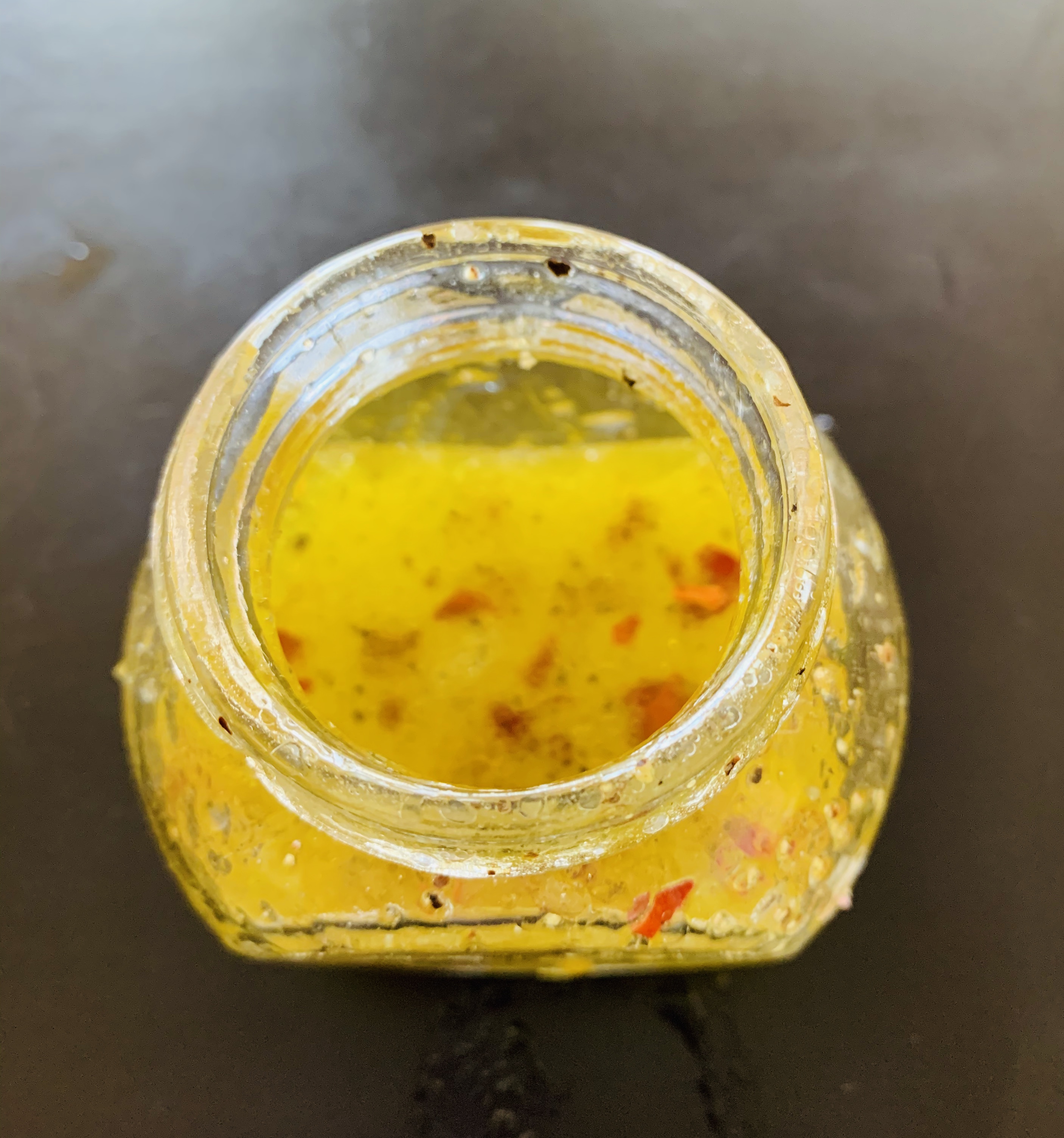 - For salad dressing – Take a jar that has tightly fitted lid. Add all the ingredients listed under ‘for salad dressing’ – olive oil, vinegar, lime juice, black pepper and crushed chilli. Close the jar with the lid tightly and shake it well.