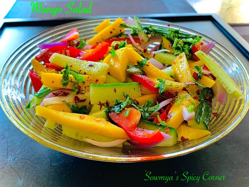 Mango Salad – a healthy, heart warming and vibrant mango salad with refreshing cucumbers, crunchy red onions and bell peppers. The thinly sliced mangoes, cucumbers, red onions and bell peppers are tossed and infused with a lime vinaigrette dressing.