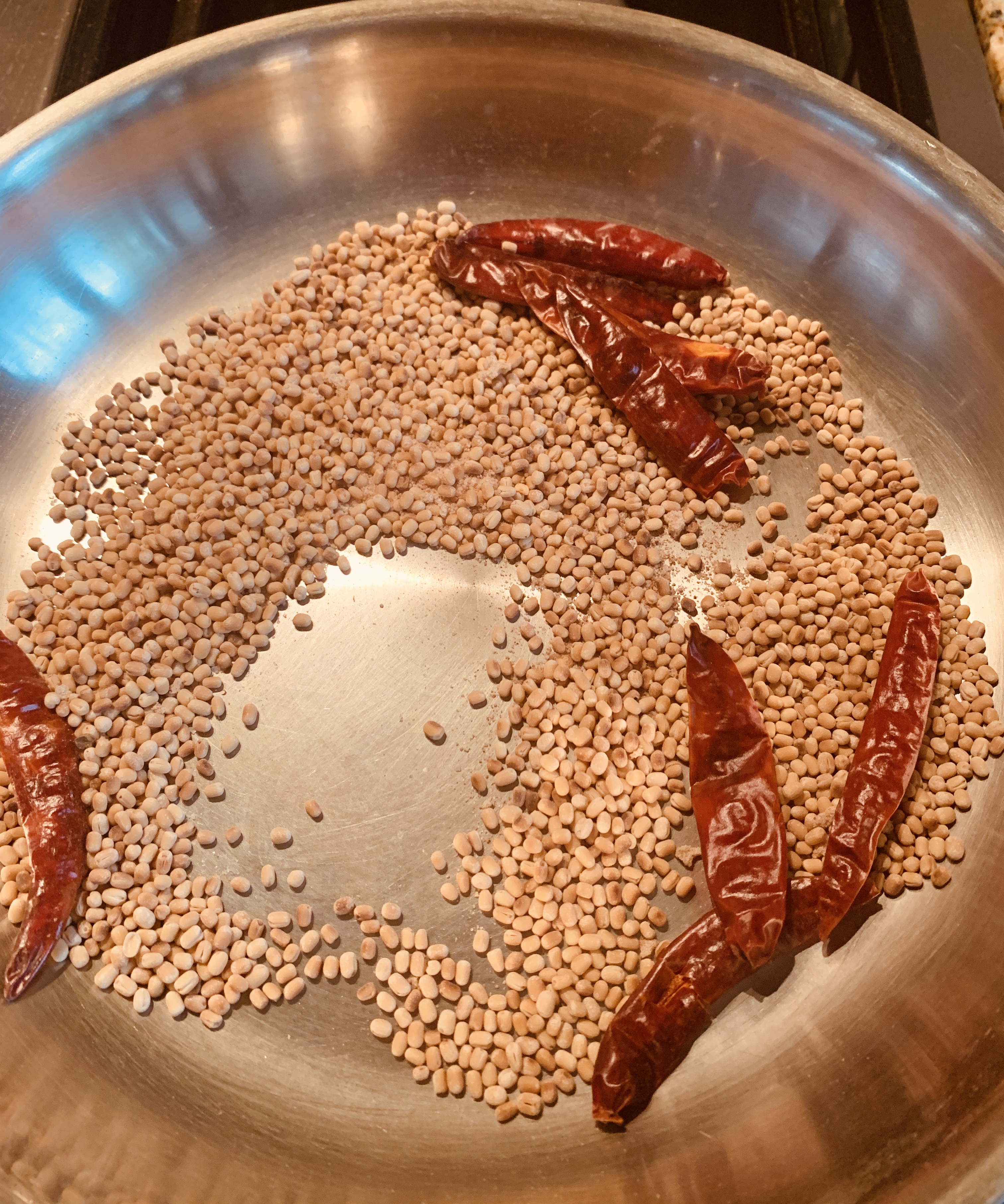 - Take a pan, dry roast the urad dhal in medium to low heat. When the urad dhal slightly changes colour, add the red chillies and roast for few seconds. Add salt and hing and give a quick stir. Transfer the contents to a plate.
