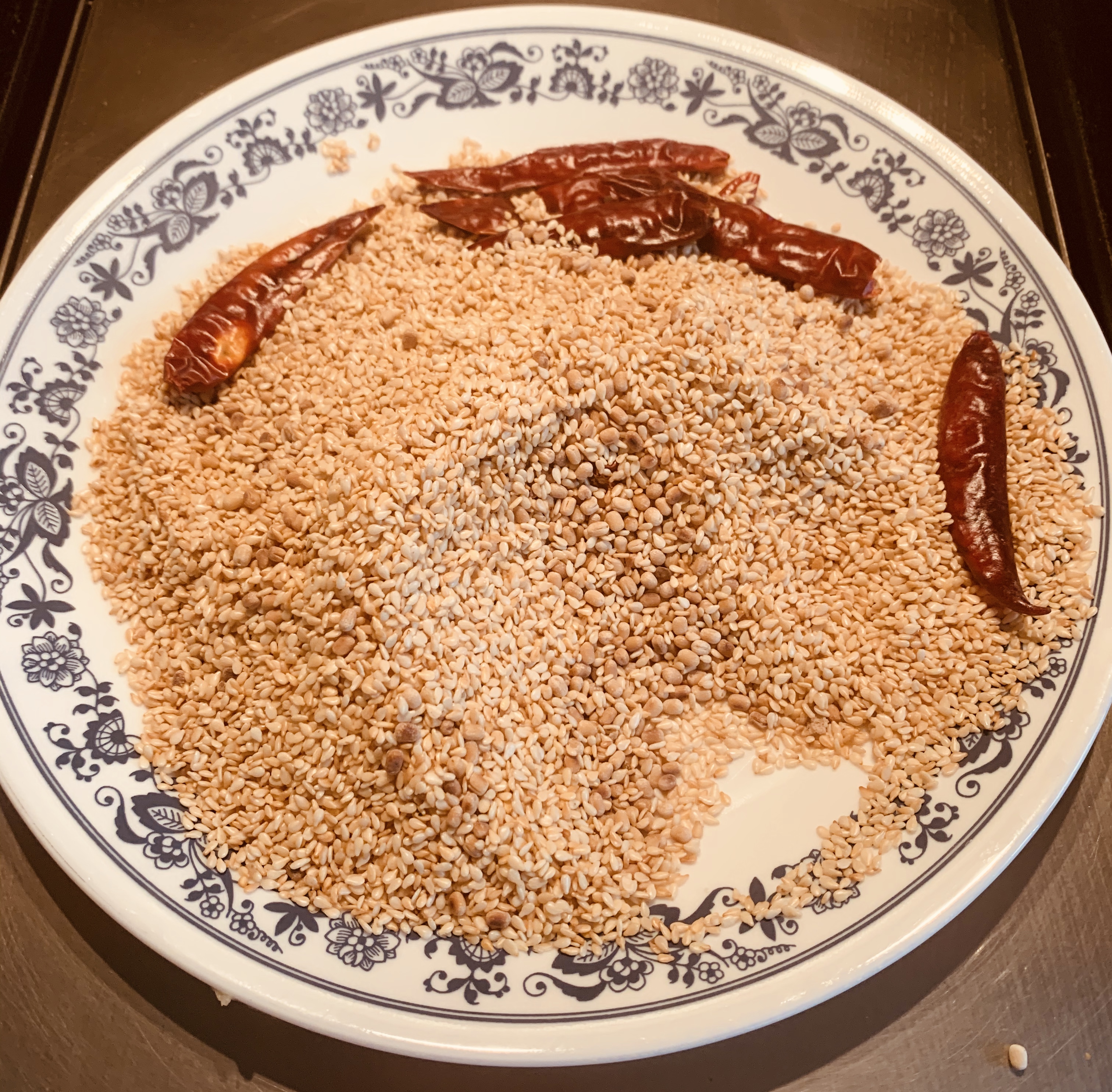 - Dry roast the sesame seeds until it starts crackling or until it turns golden brown. Transfer the roasted sesame seeds to the plate with urad dhal and red chillies. Allow it to cool.