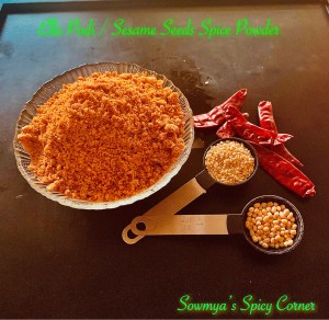 Ellu Podi / Sesame seeds Spice Powder March 16, 2021 Sowmya Leave a comment Share this with Share on Facebook (Opens in new window) Facebook Share on X (Opens in new window) X Share on Pinterest (Opens in new window) Pinterest Share on WhatsApp (Opens in new window) WhatsApp Print (Opens in new window) Print Email a link to a friend (Opens in new window) Email Like Loading...