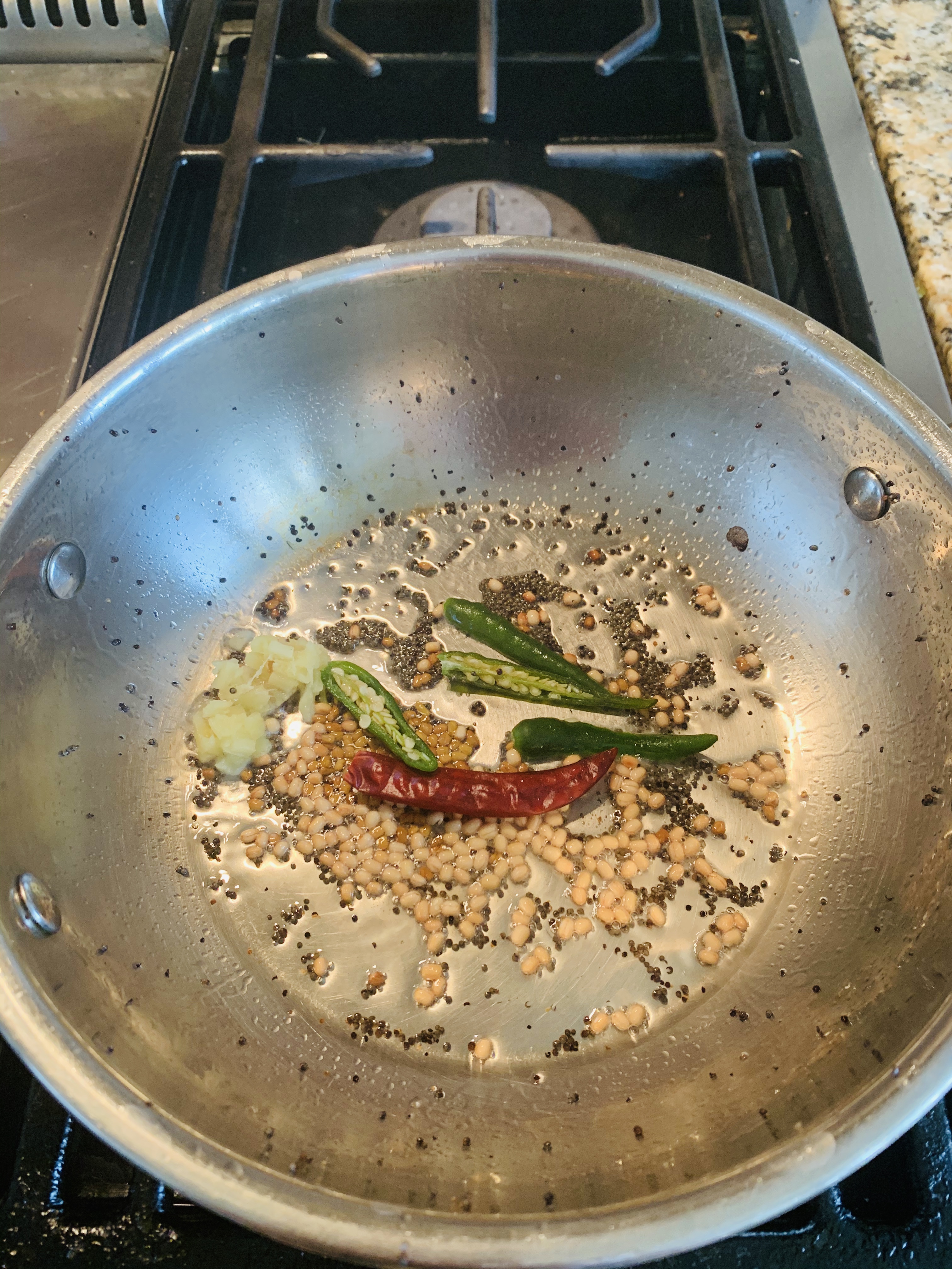 • Heat a pan with 1 tablespoon oil. When the oil is warm enough, add mustard seeds. Allow the mustard seeds to crackle, add urad dhal and sauté for few seconds in low flame. When the urad dhal starts changing colour, add the slit green chillies, chopped ginger and red chilli . Sauté for few seconds until the urad dhal turns golden brown.