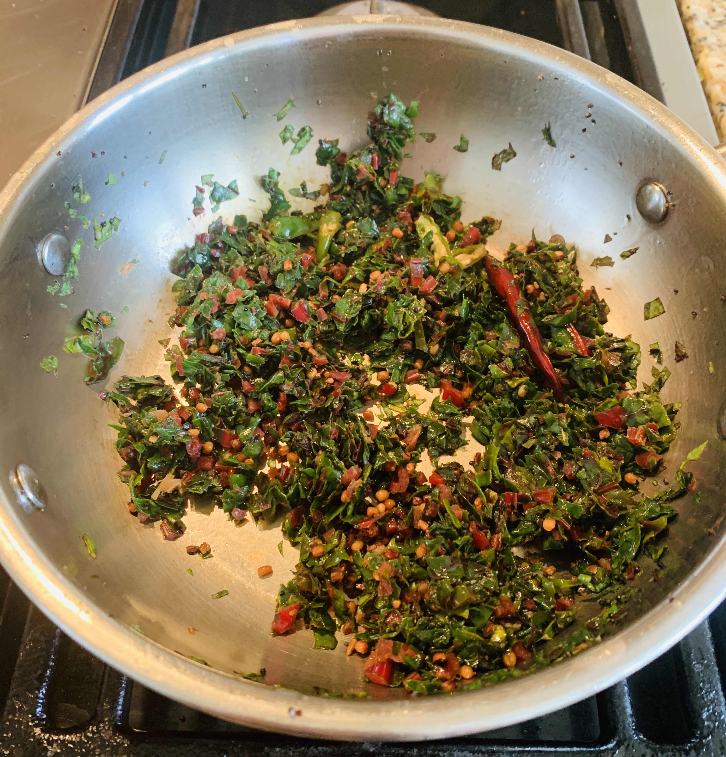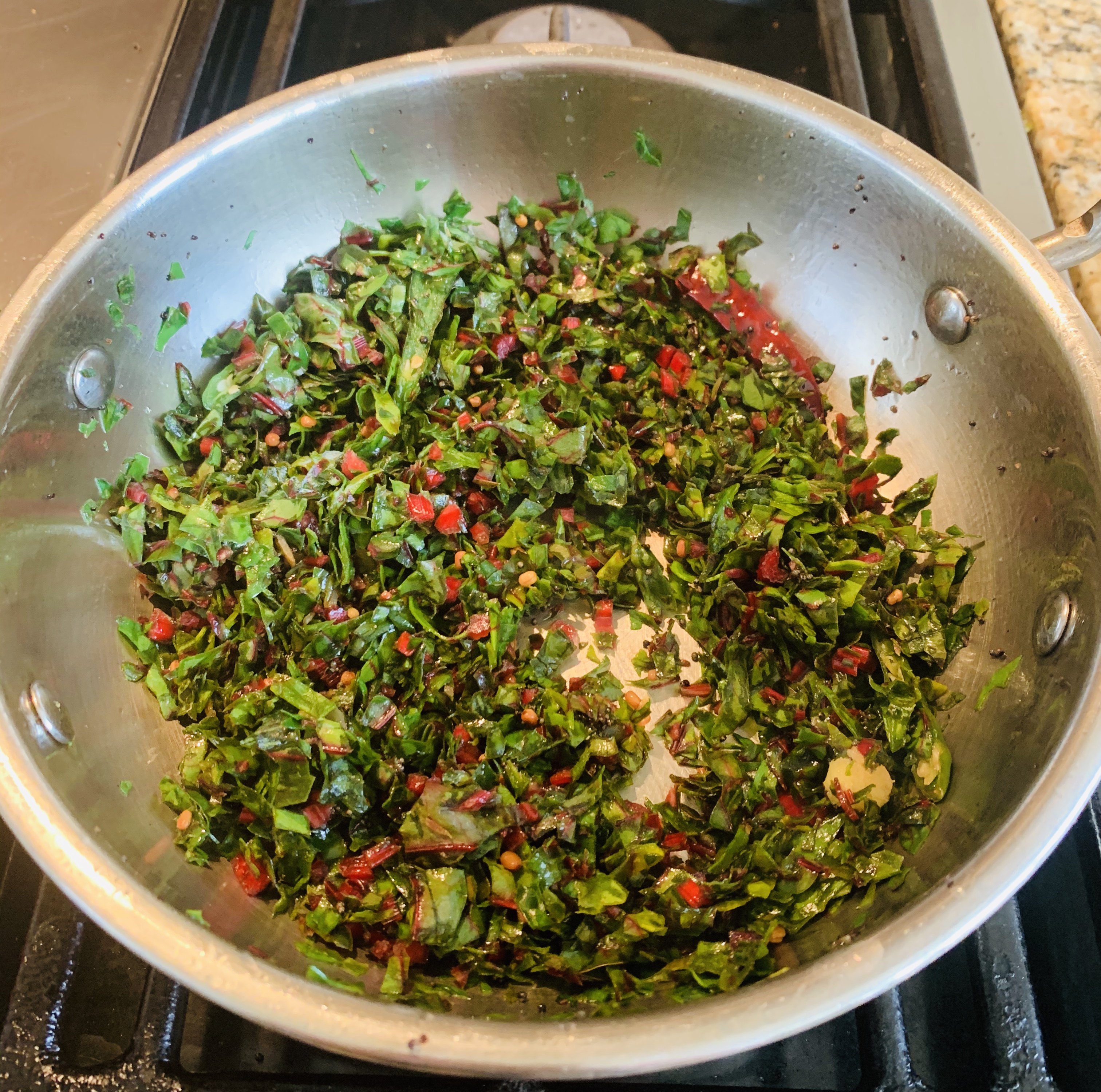 • Now add the finely chopped swiss chard and stir every now and then. Sauté this until the leaves shrink in size.