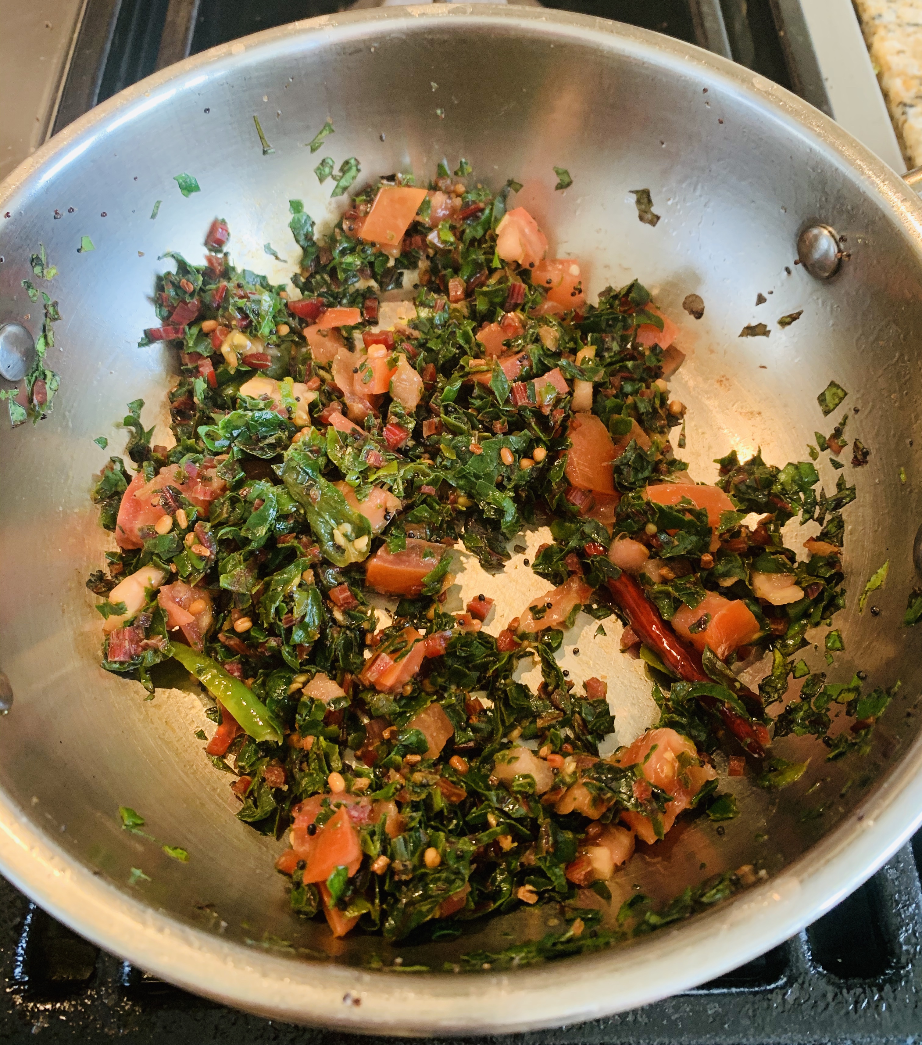 • Wash the swiss chard thoroughly. Discard the hard red stem. Include the tender part of the stem (optional). Finely chop the leaves and the tender part of the stem. Finely chop the tomato, ginger and slit the green chillies.