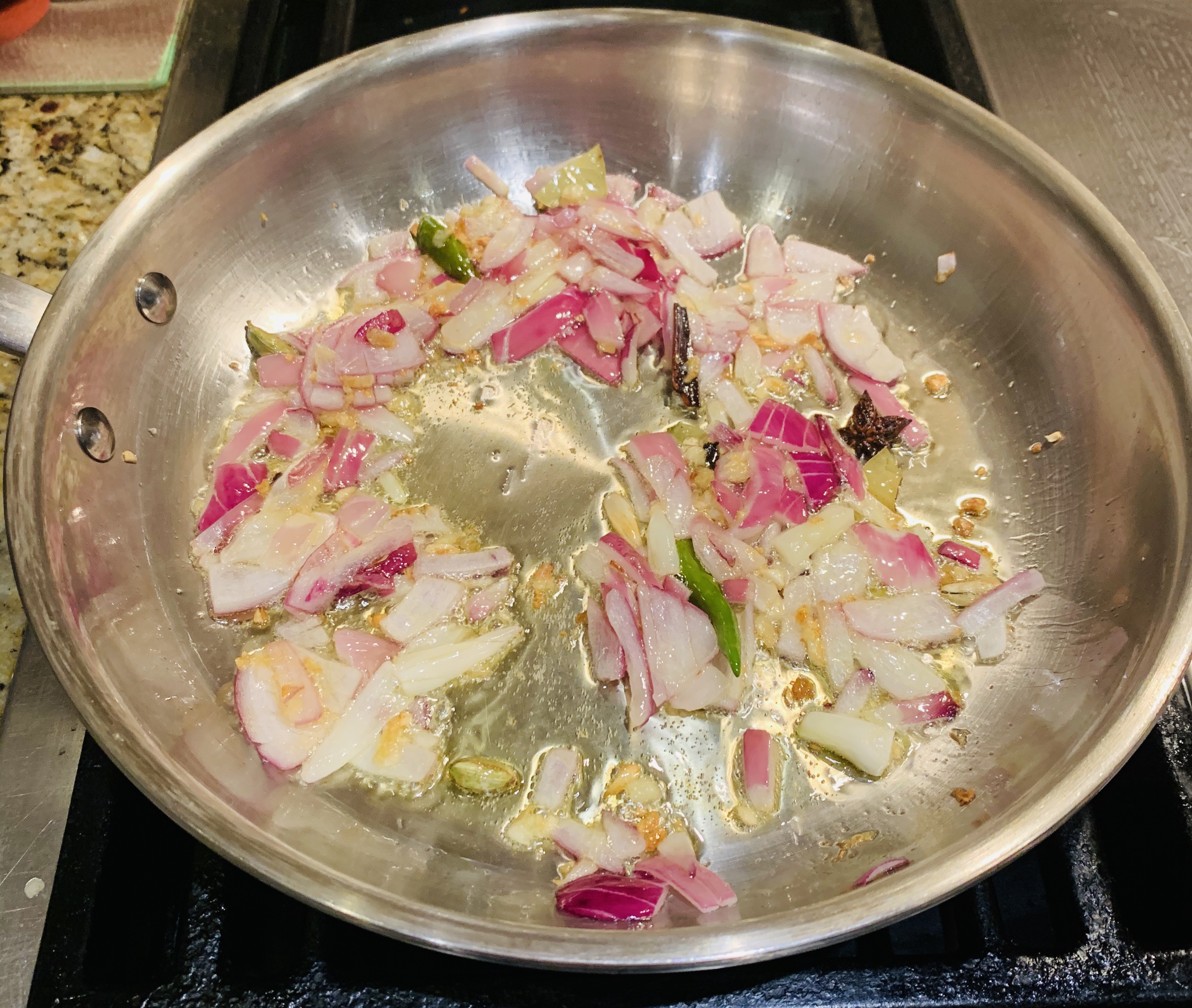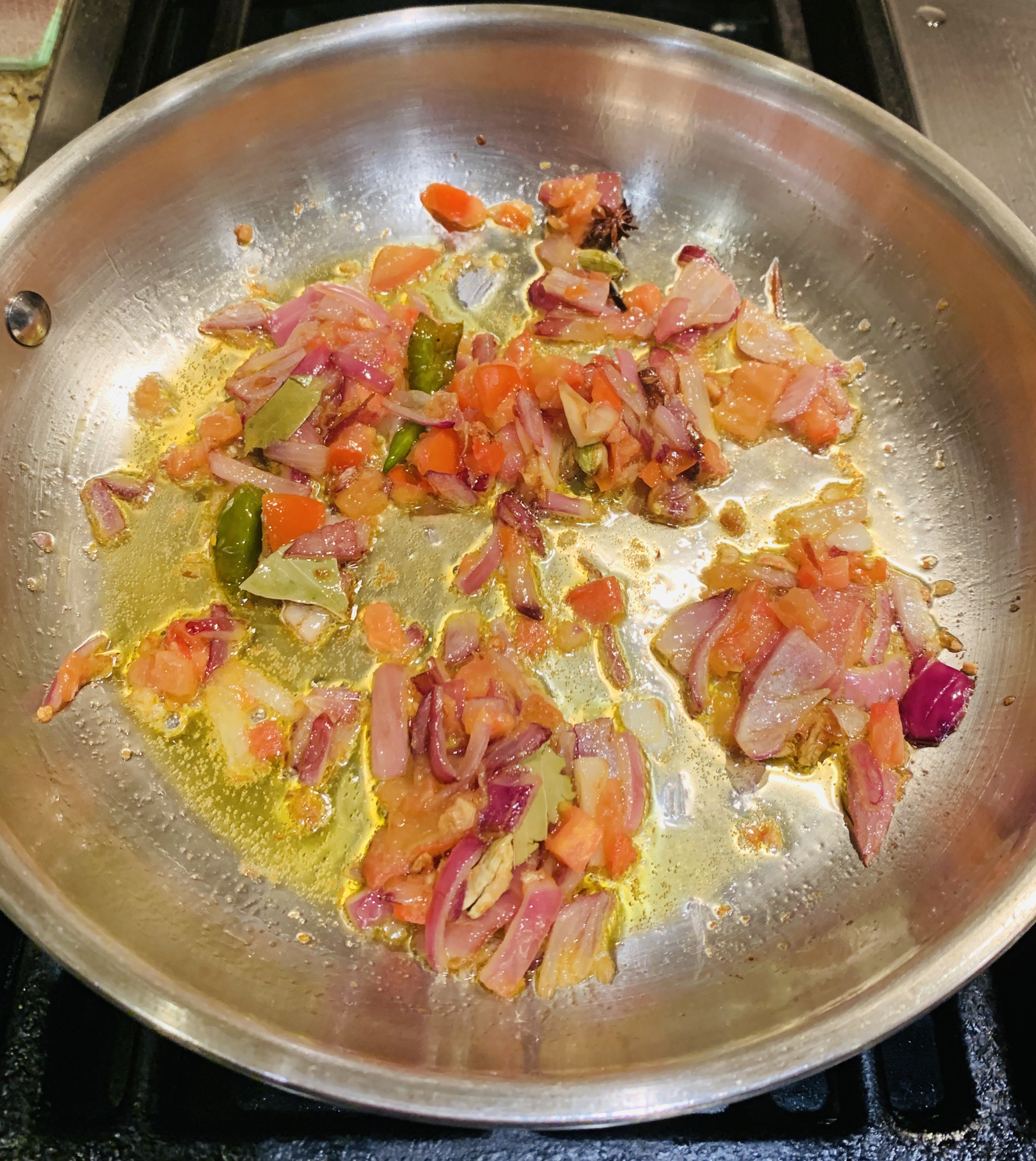- Add the chopped onion and sauté until it becomes transparent. Now add the chopped tomato. Close with a lid and cook in low flame until the tomato is soft and mushy.