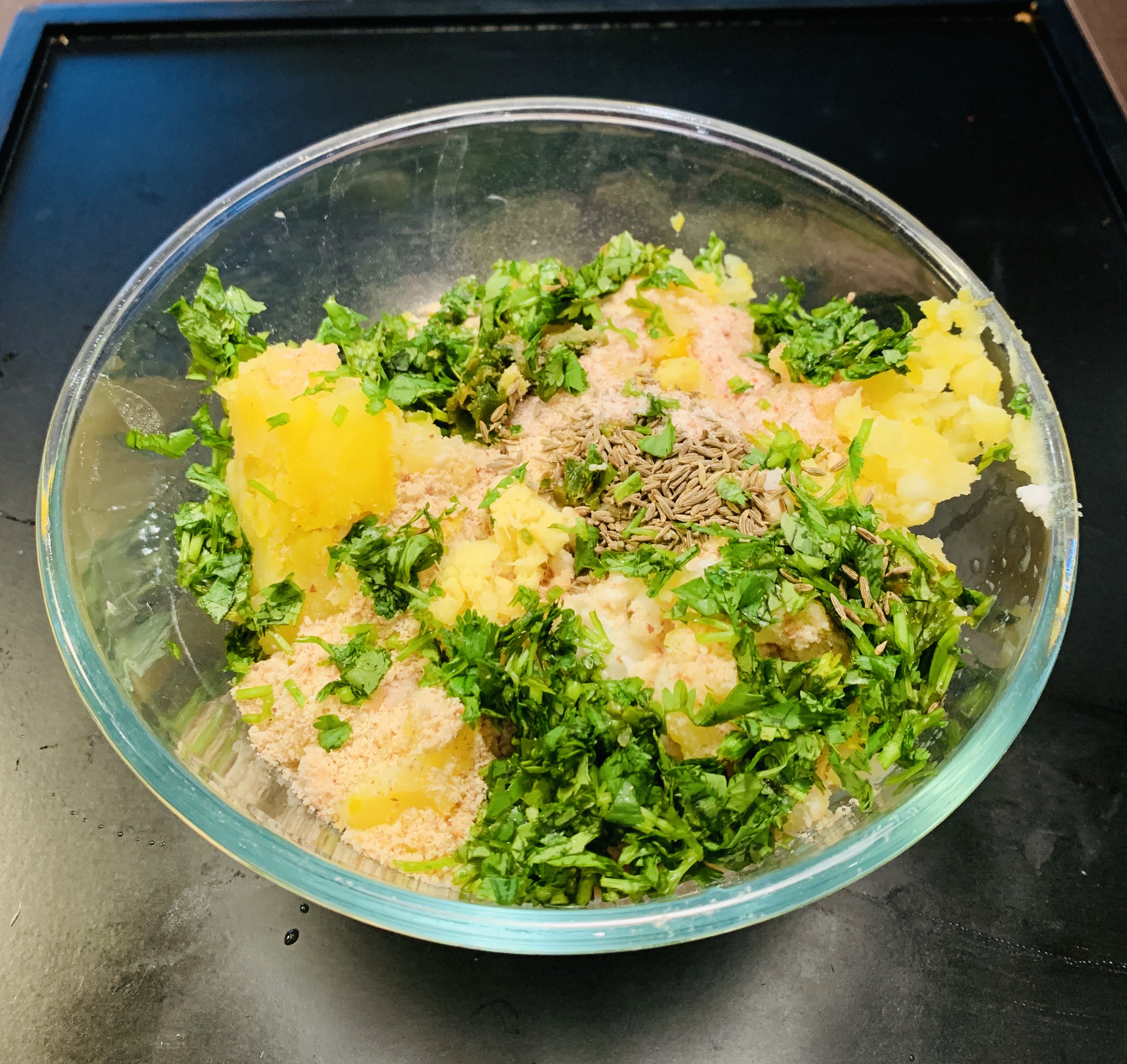 - Using hands mix everything well. Grease your palms lightly with oil and mix and mash all the contents in the bowl. Mashing the contents thoroughly will help in binding the contents together.