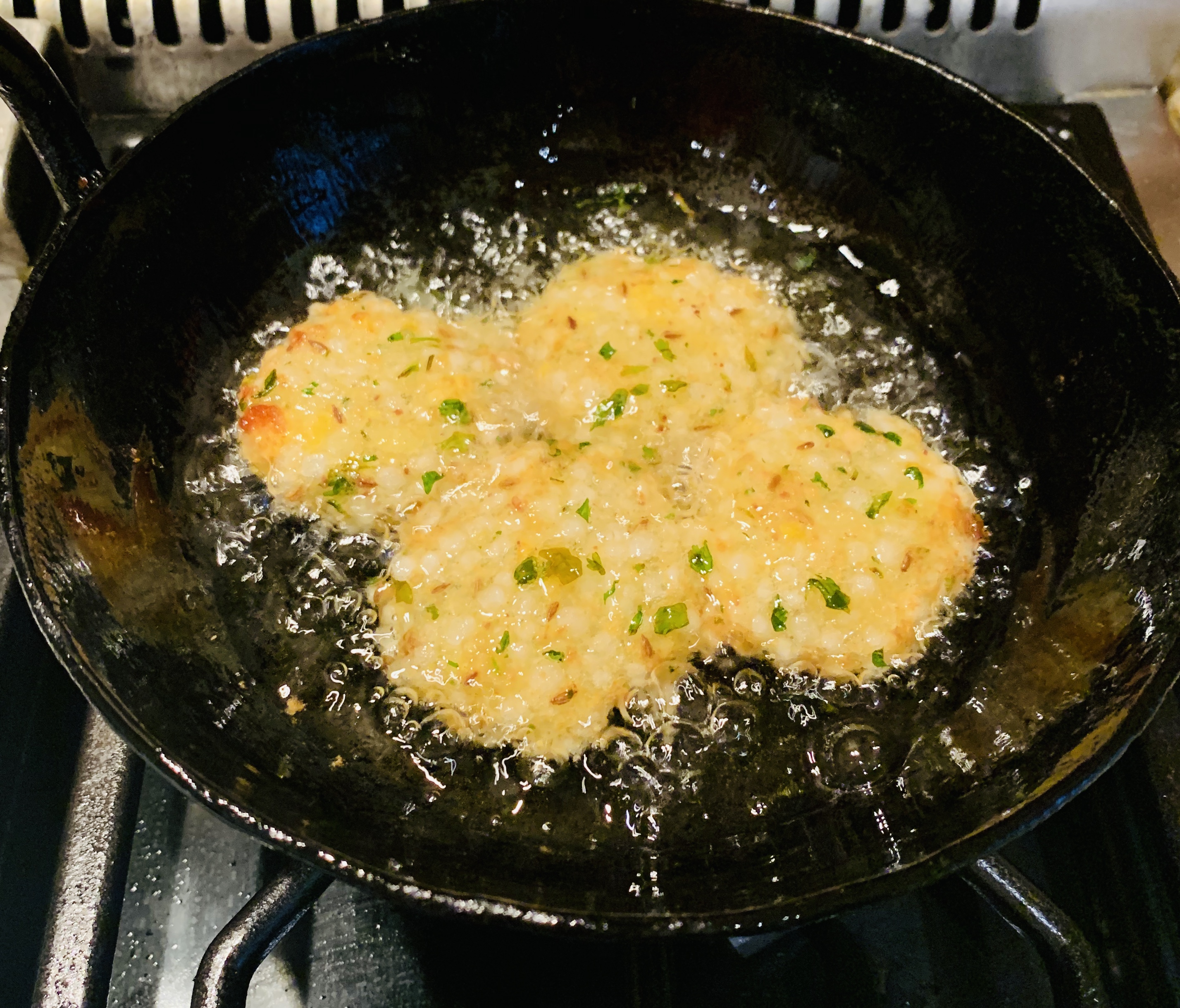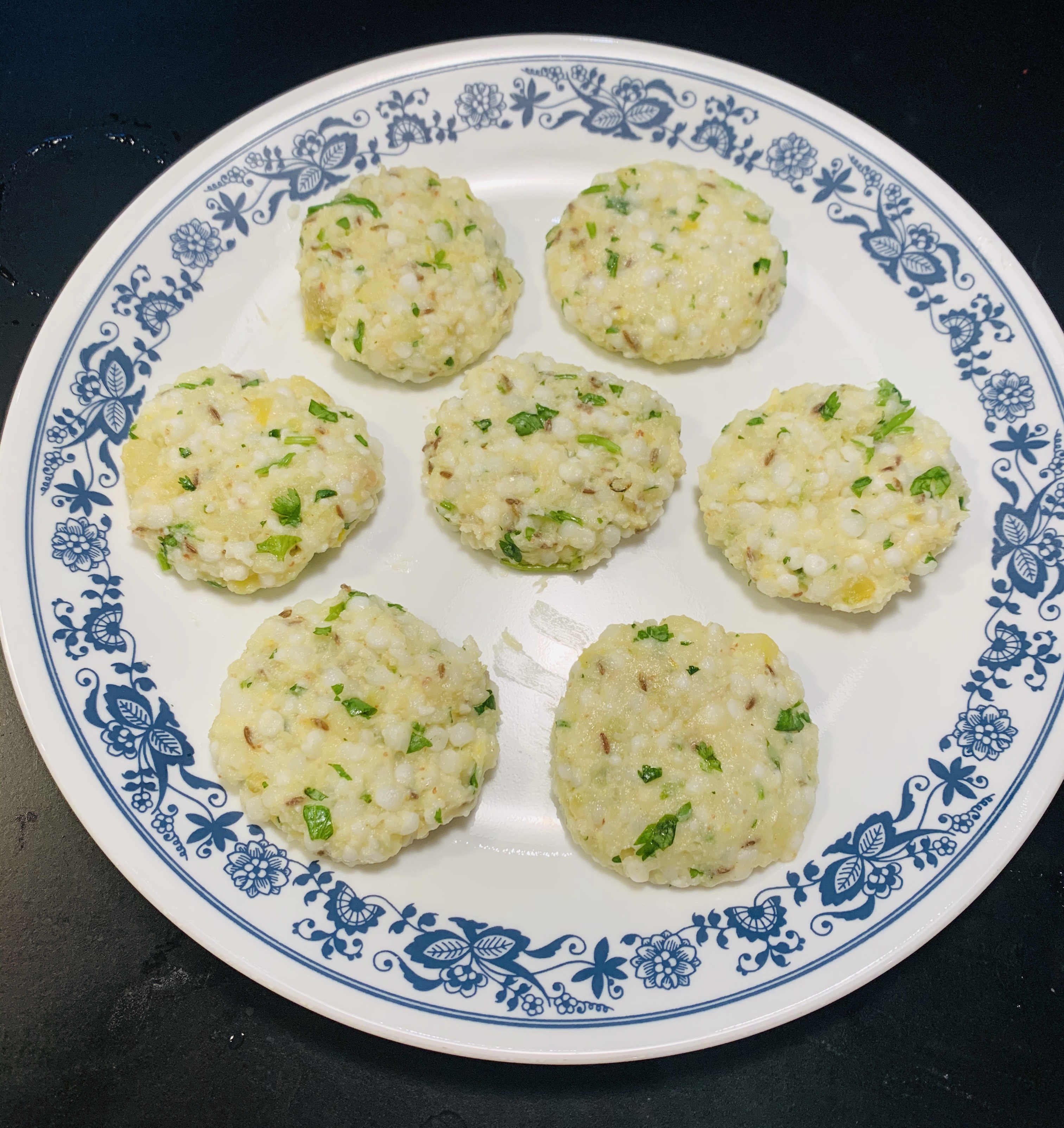 - Making of sabudana vada – Grease your palm once again. Take a small round portion of the dough and make a small ball. Place the ball on the left palm and gently pat it with your right fingers to flatten it. Make the rest of the dough in a similar way. This recipe will yield 15 to 20 medium size sabudana vada.