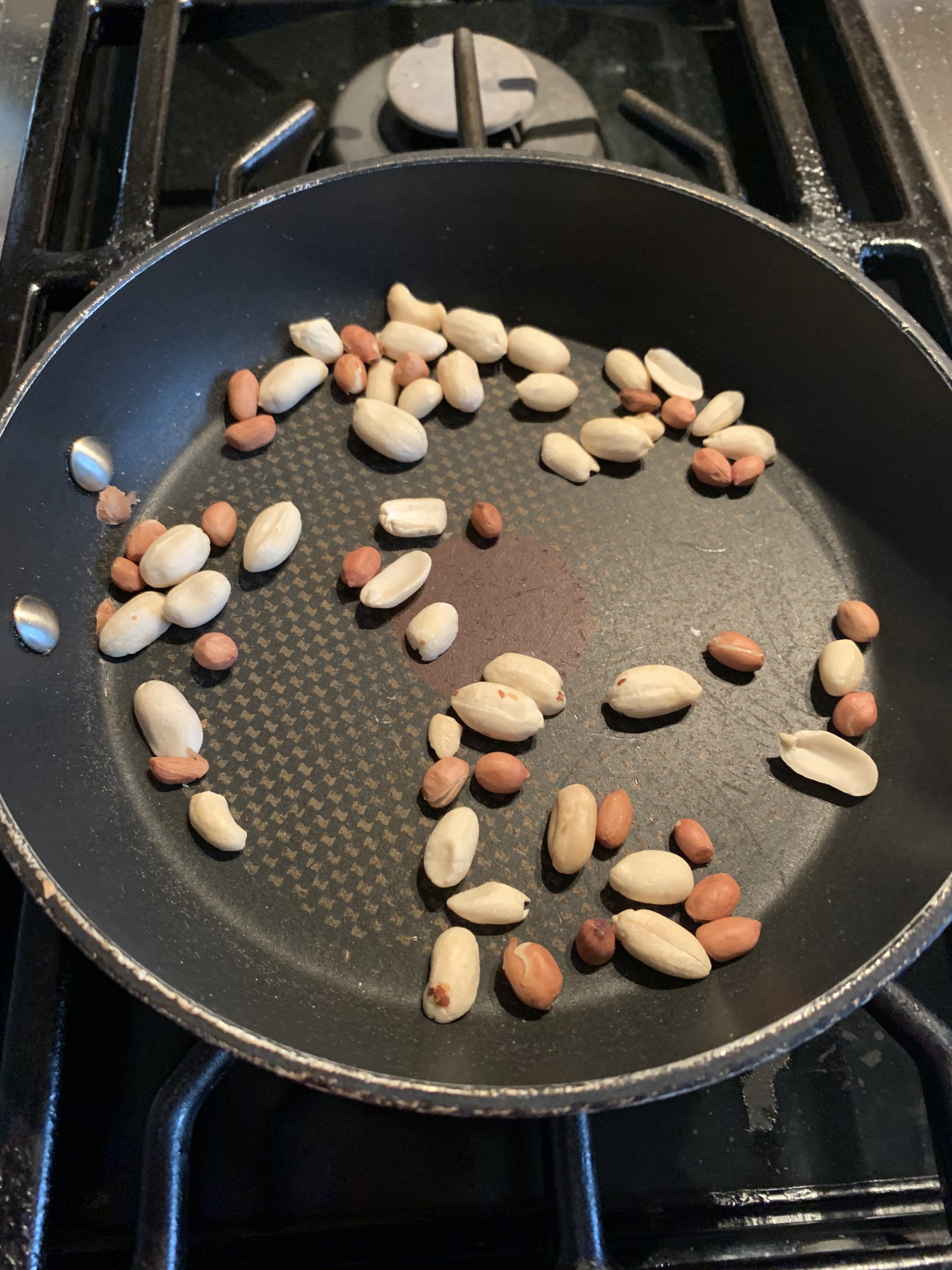 - In a pan, dry roast 1/4 th cup peanuts until they are golden brown colour. You can discard the skin or retain it as per your preference. Allow it to cool. Grind it to a coarse powder.