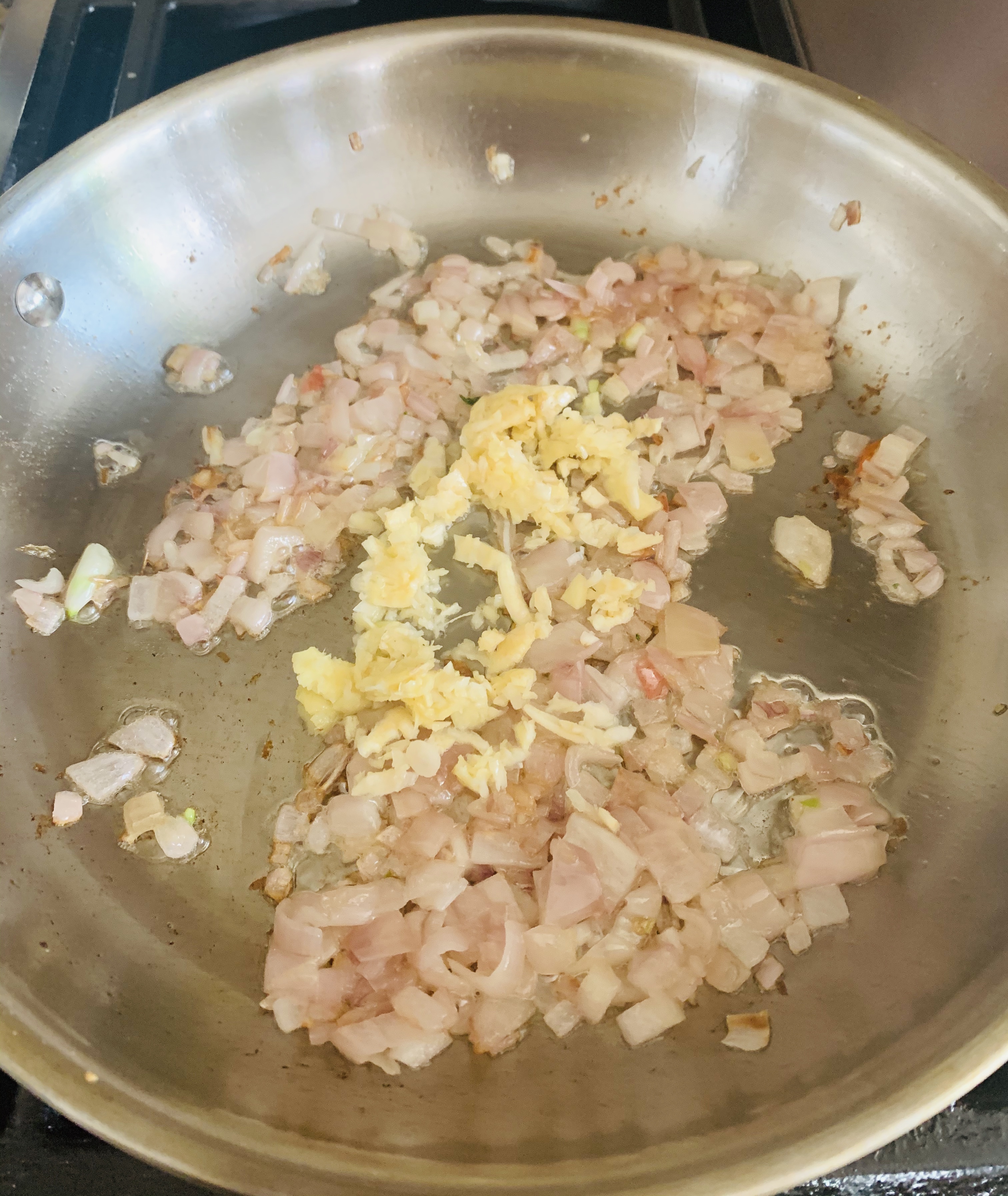 - Take a wide mouthed pan, add 2 tablespoon oil or 1 tablespoon oil and 1 tablespoon butter. When the oil is warm enough, add the chopped onion. Sauté the onions until it is soft and transparent. Now add ginger and garlic paste. Sauté until the raw smell of ginger and garlic goes way.