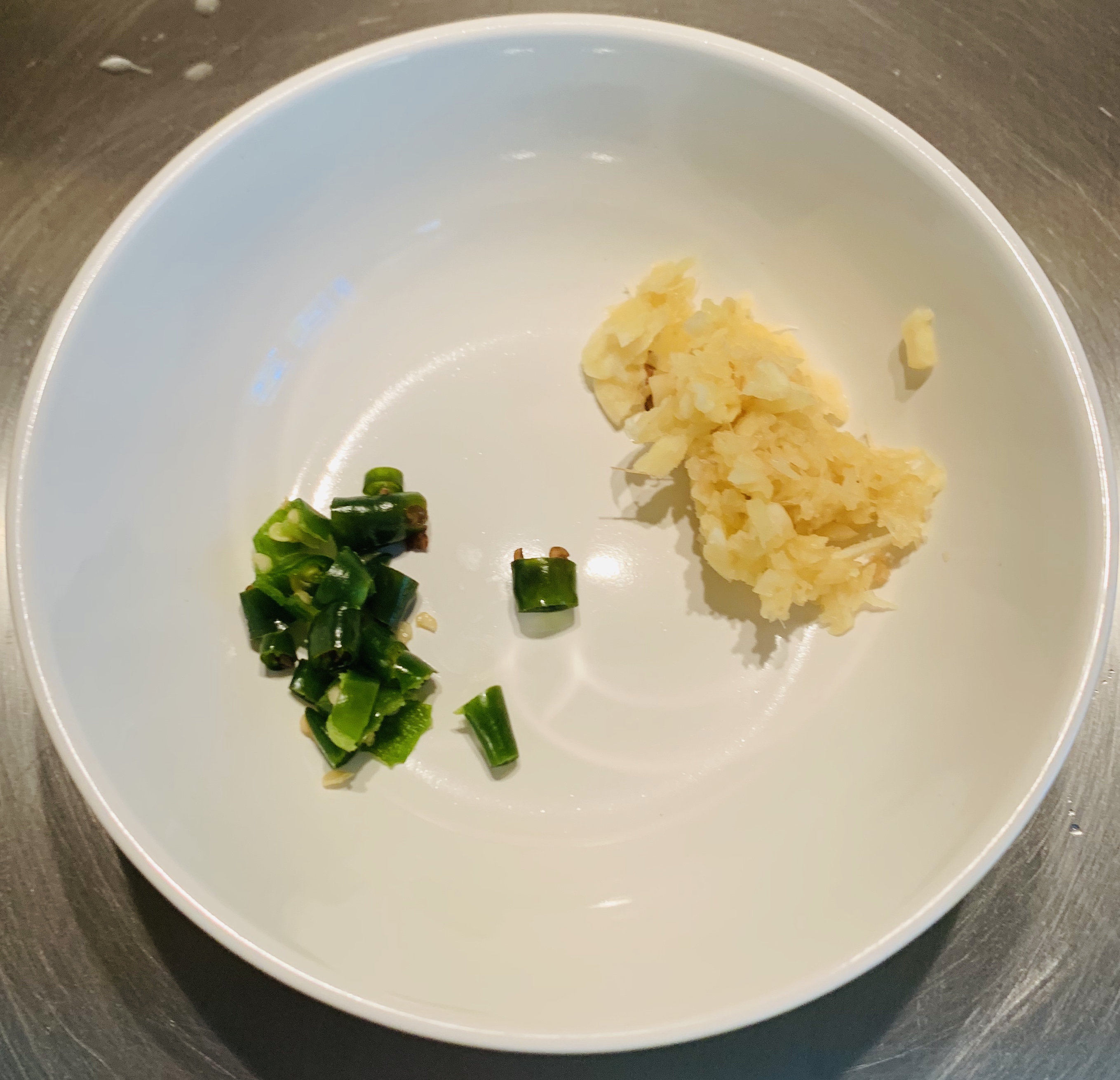 - Add the chopped green chillies and crushed ginger-garlic paste. Sauté for a minute in low flame until the raw flavour goes away.