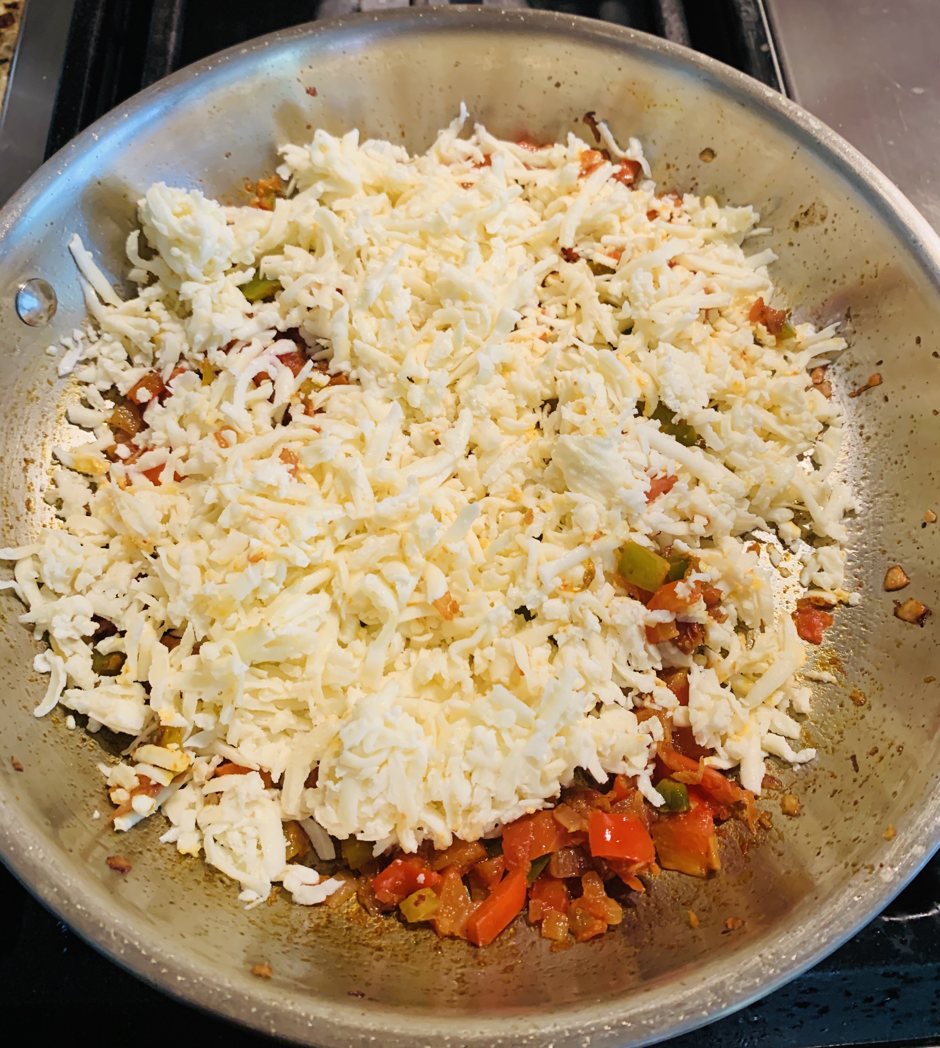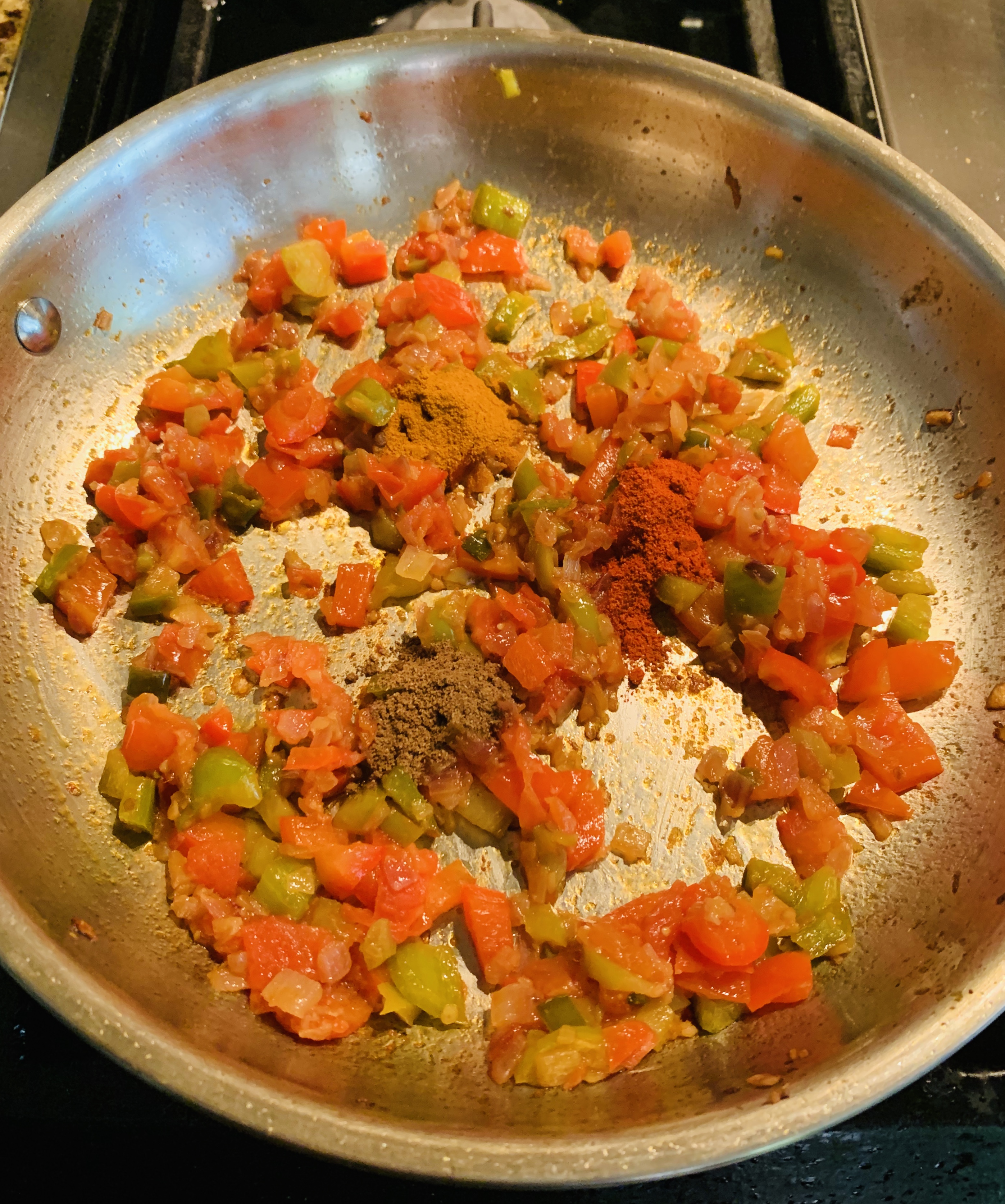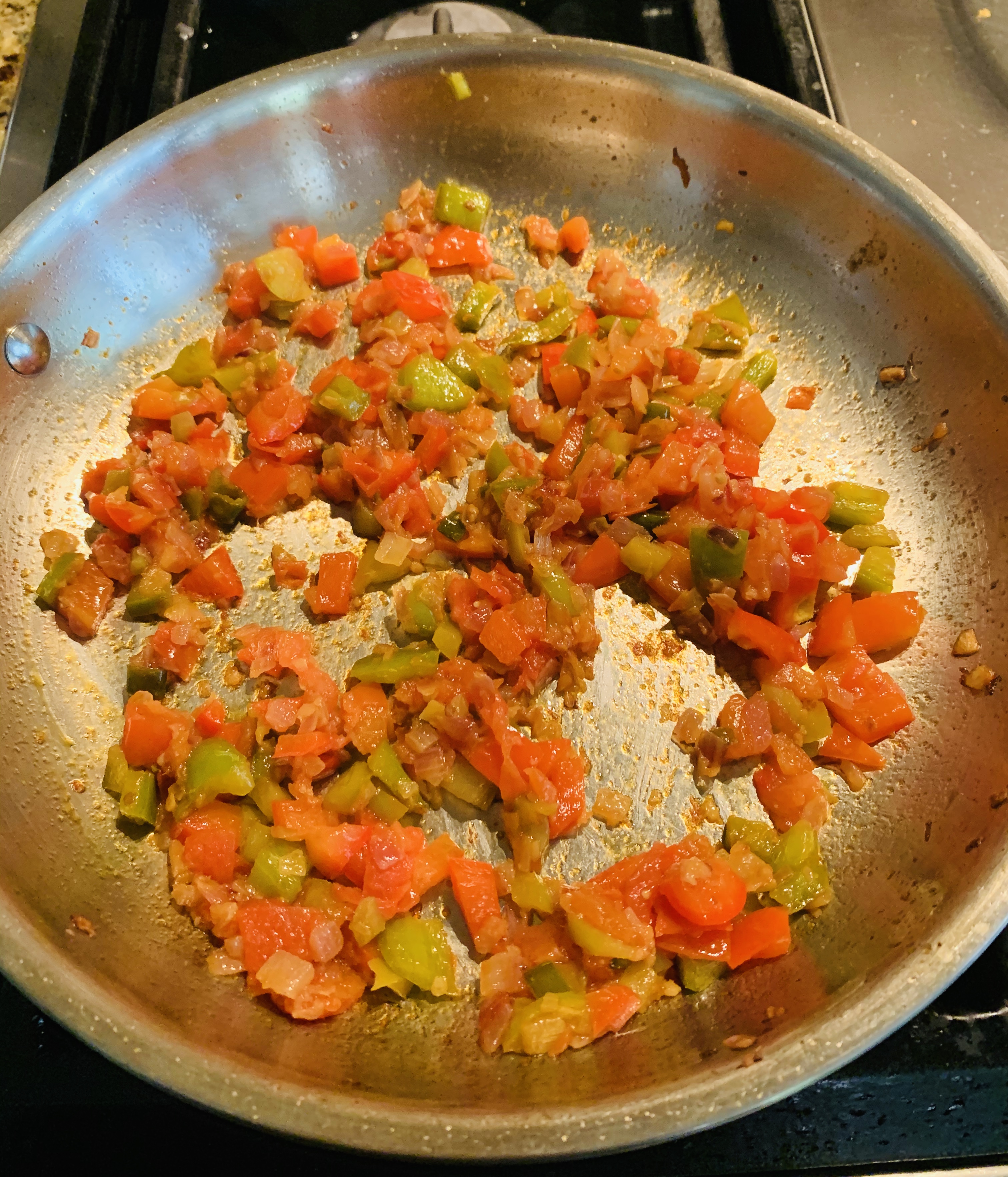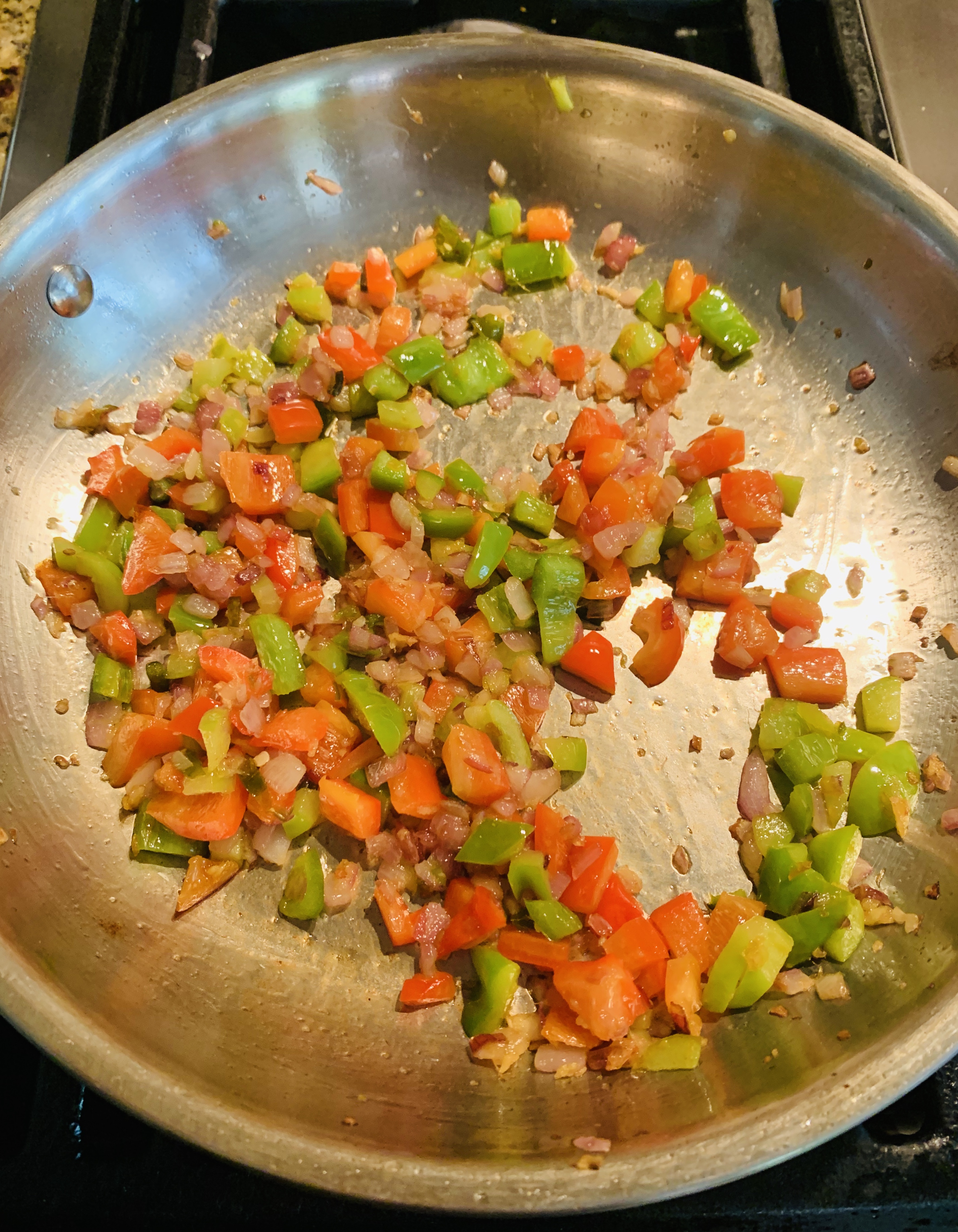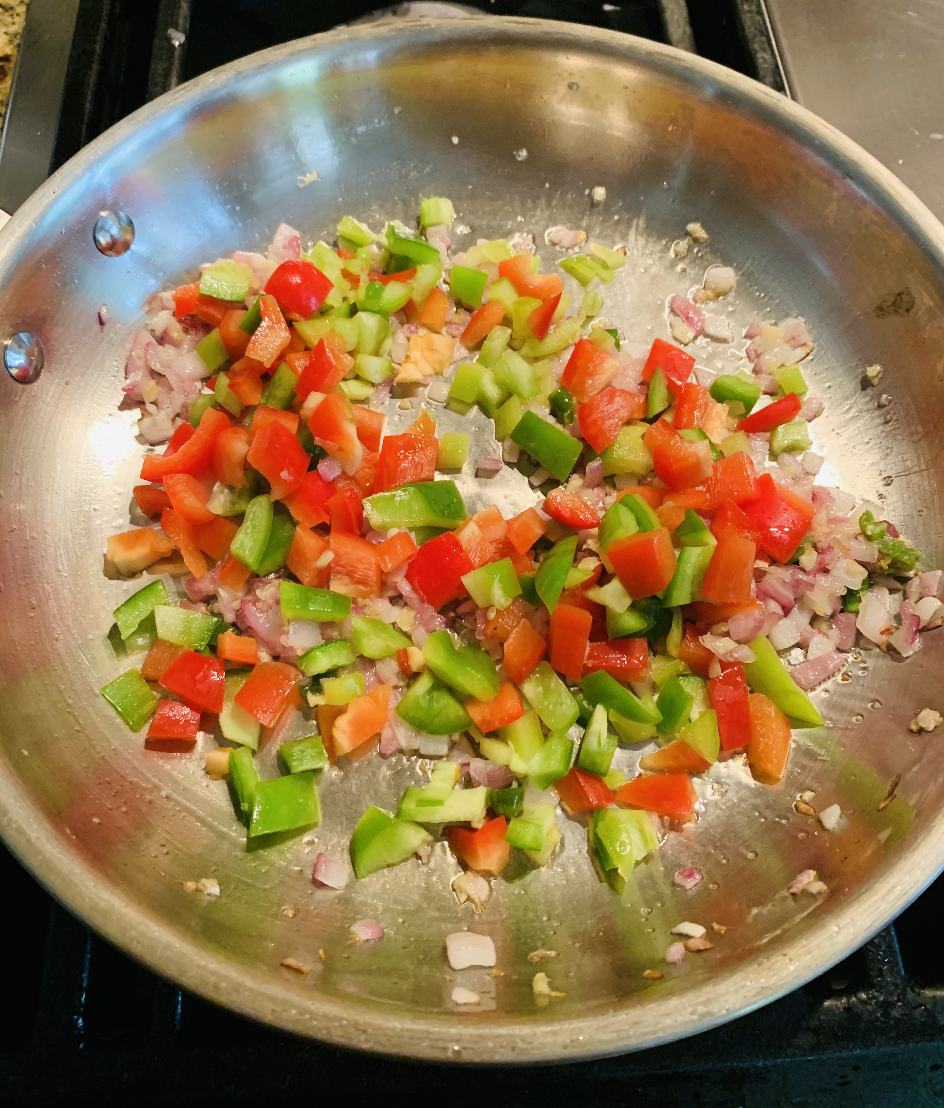 - Add the sliced green and red peppers and sauté for 1 to 2 minutes until the bell peppers are tender.