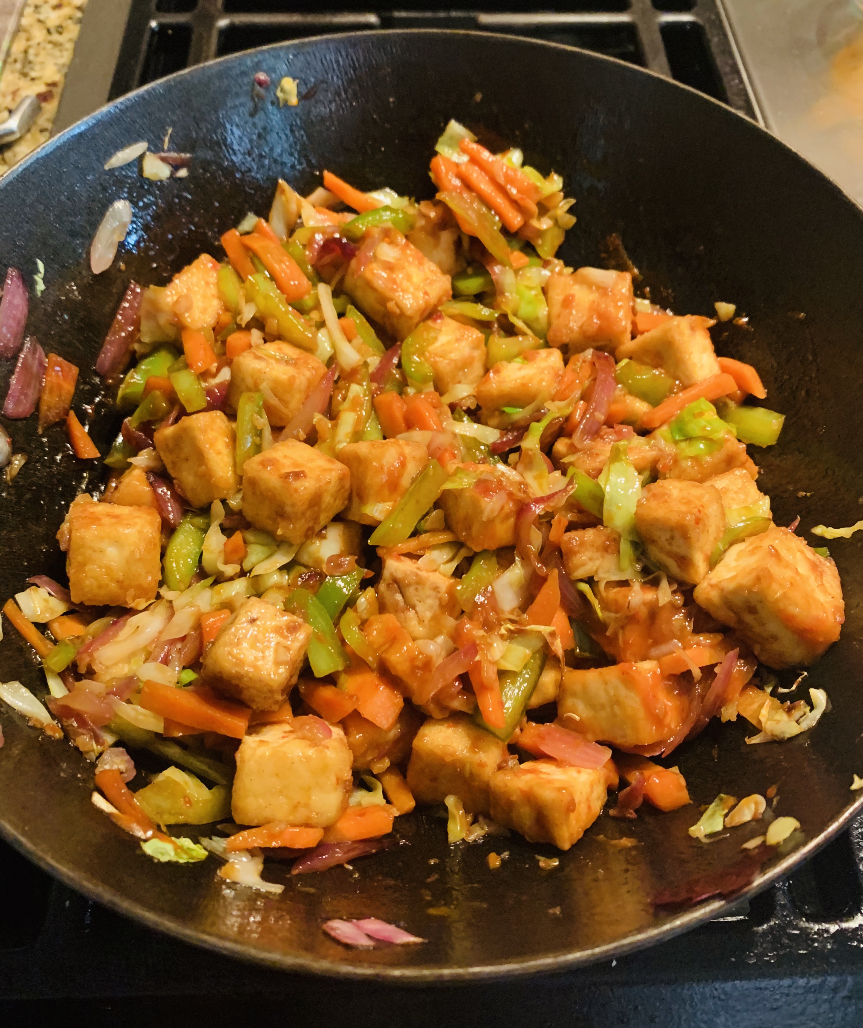 - Reduce the flame and add all the sauces – soy sauce, chilli garlic or chilli sauce, schezwan sauce and vinegar. Increase the heat to medium-high and toss the vegetables and tofu quickly with the sauce until it is all mixed thoroughly.
