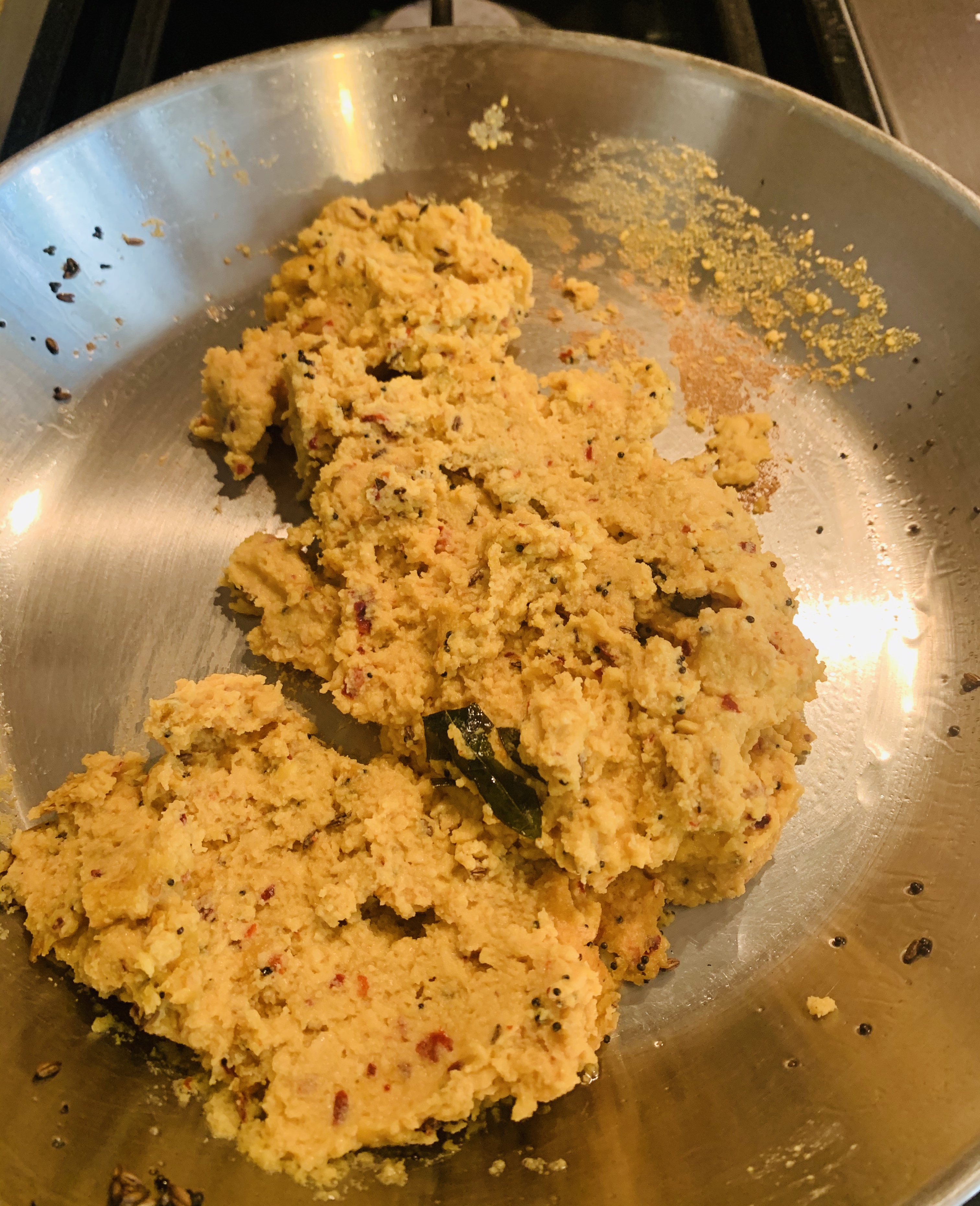 - Heat a pan and add 1 to 2 teaspoon oil. Add mustard seeds. When the mustard seeds crackle, add hing and curry leaves. Add the ground paste and sauté for 1 to 2 minutes until the excess moisture is removed. Do not overcook the paste as this will harden the ground paste. Transfer this to a bowl.