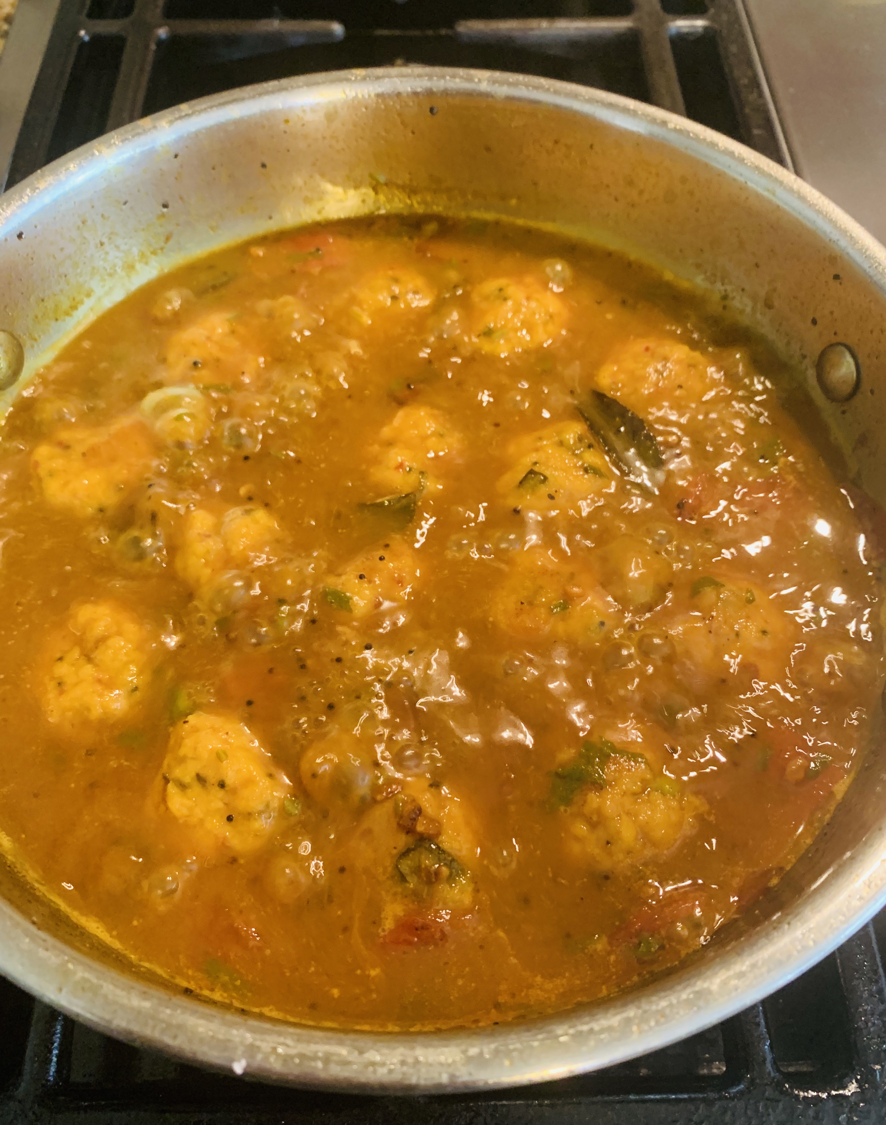 - When the kuzhambu comes to a boiling state, add the steam cooked lentil balls. Add the lentil balls one by one gently leaving 10 -15 seconds in-between.