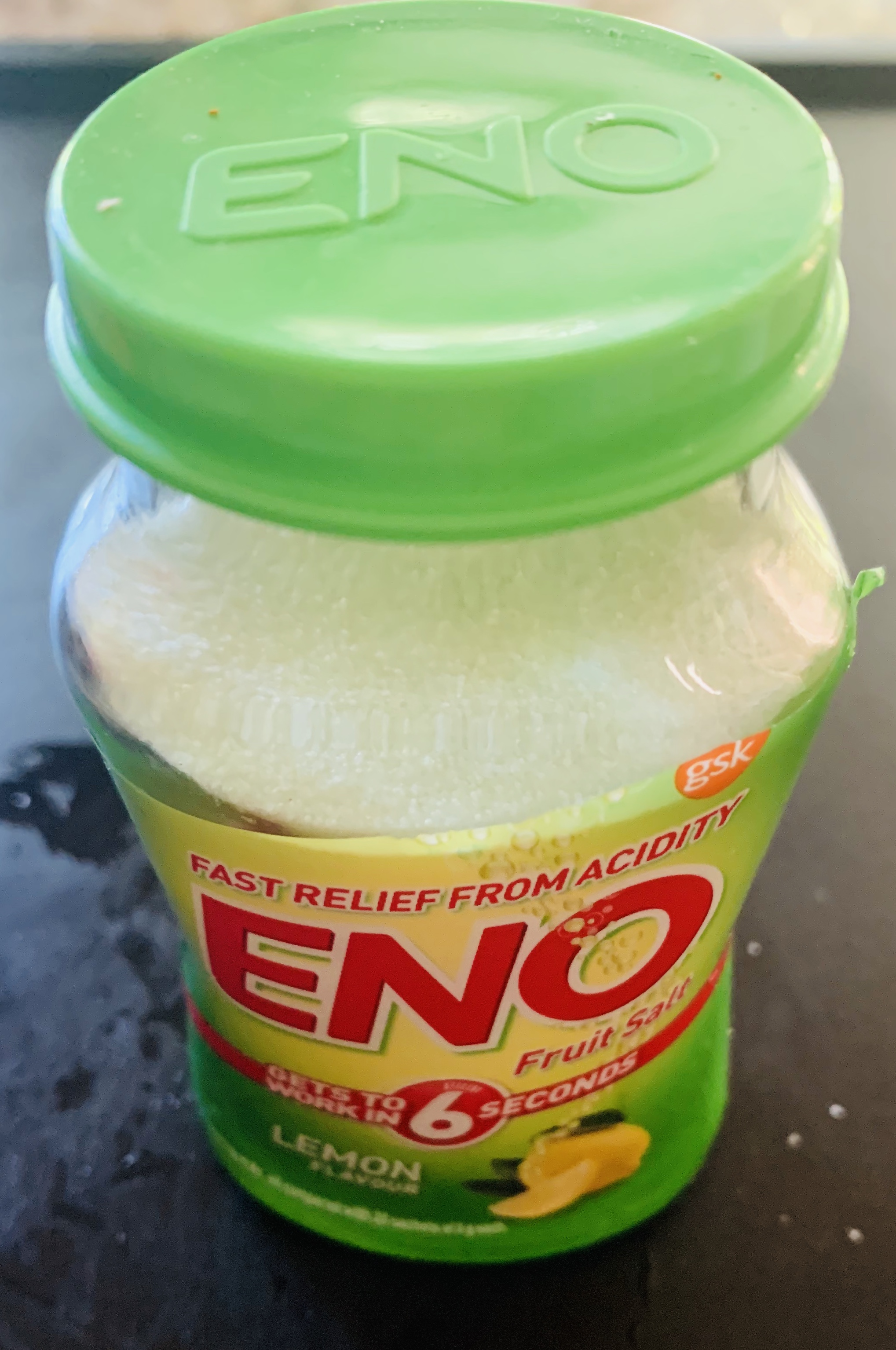 Eno or fruit salt is a term used for compounds that are effervescent. The components of Eno or fruit salt include organic acids like citric acid or tartaric acid and salts such as sodium bicarbonate and sodium carbonate. In addition to this they may contain some flavouring agents and sugar. These fruit salts are widely used as antacids and as a leavening agent in Indian cuisine.