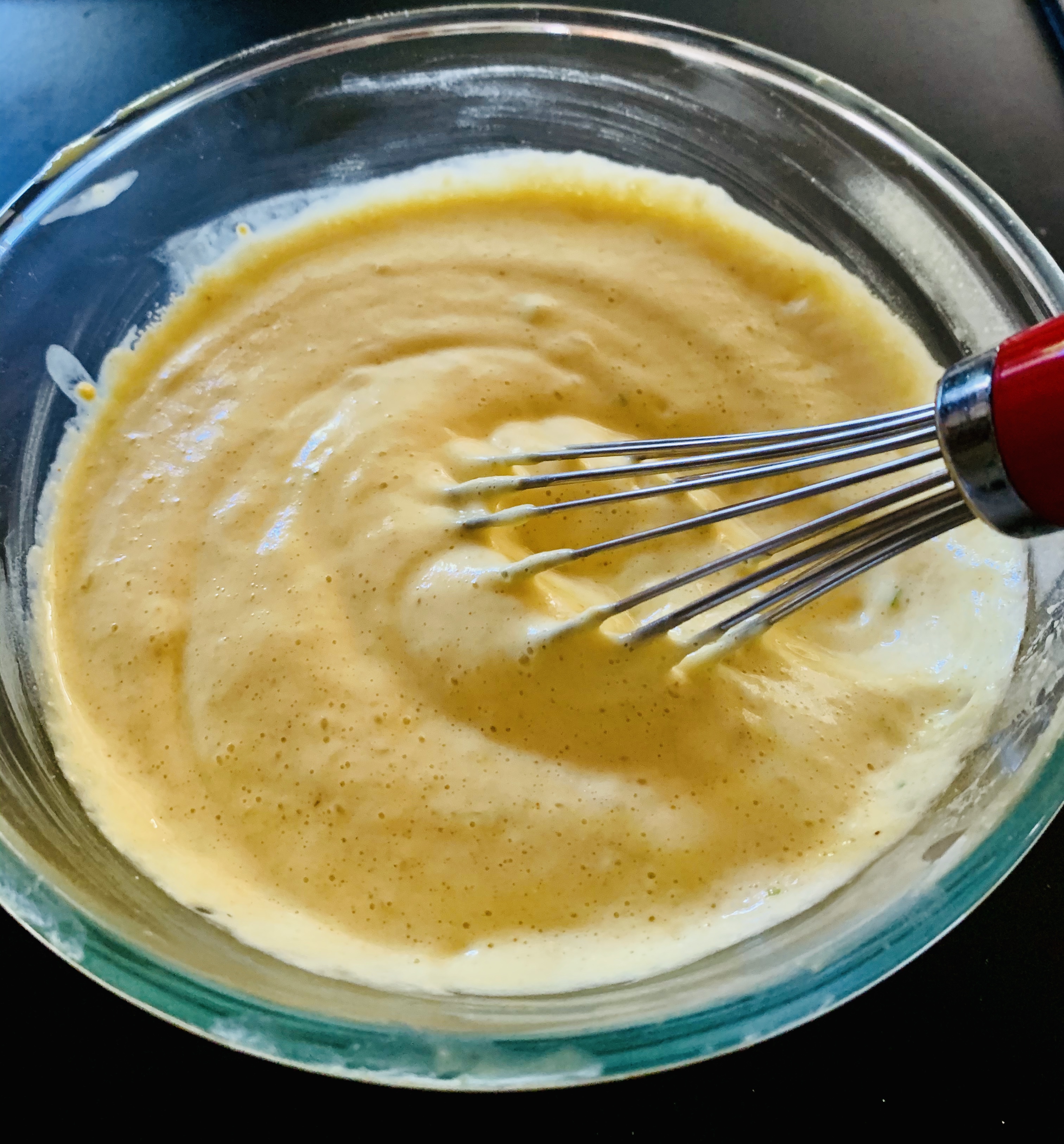 - Stir the contents again using a whisk to get a uniform and smooth flowing batter. If the batter is too thin, add 1 to 2 tablespoons of gram flour and mix well.