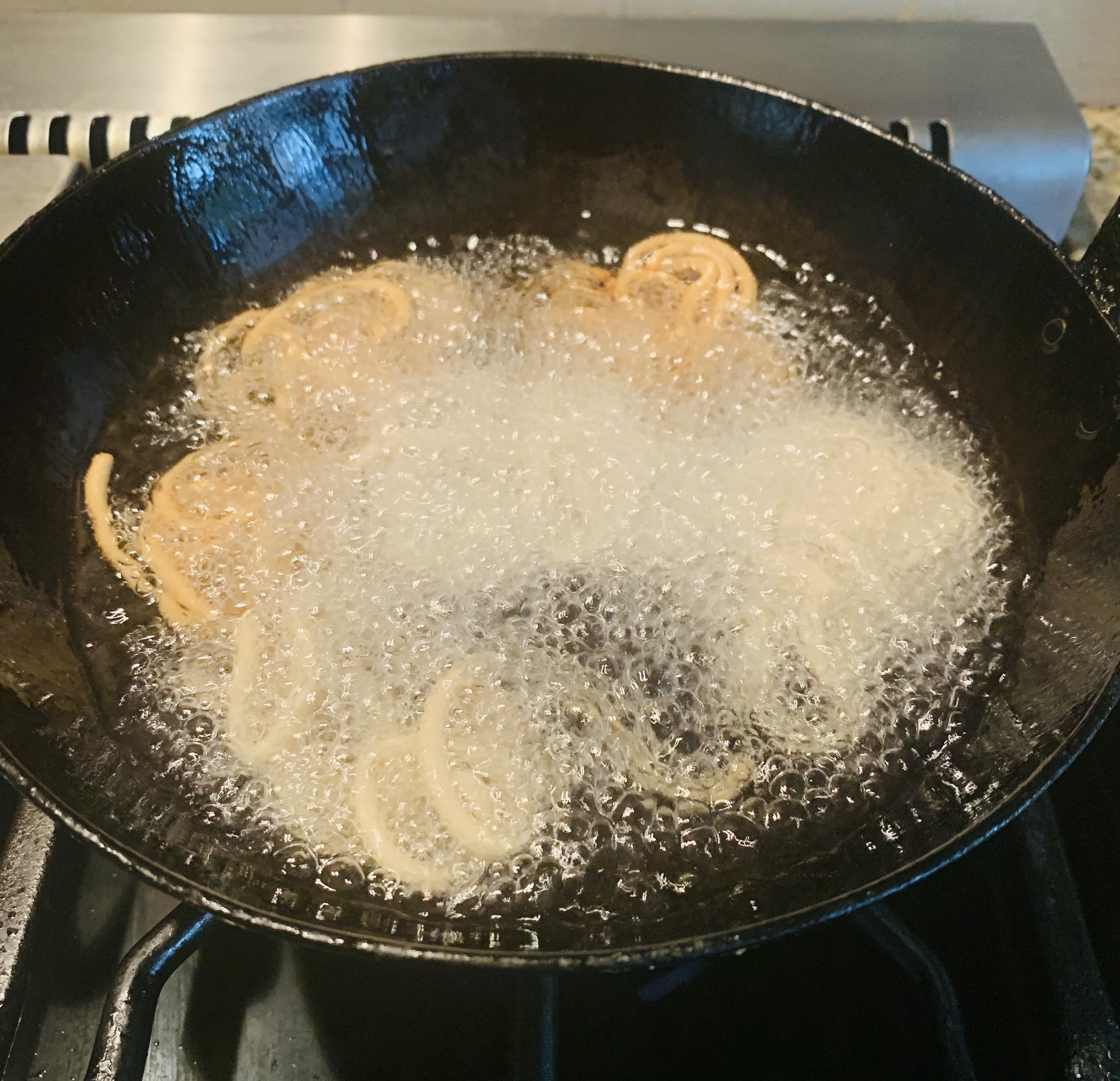 - Heat enough oil in the kadai for deep frying.