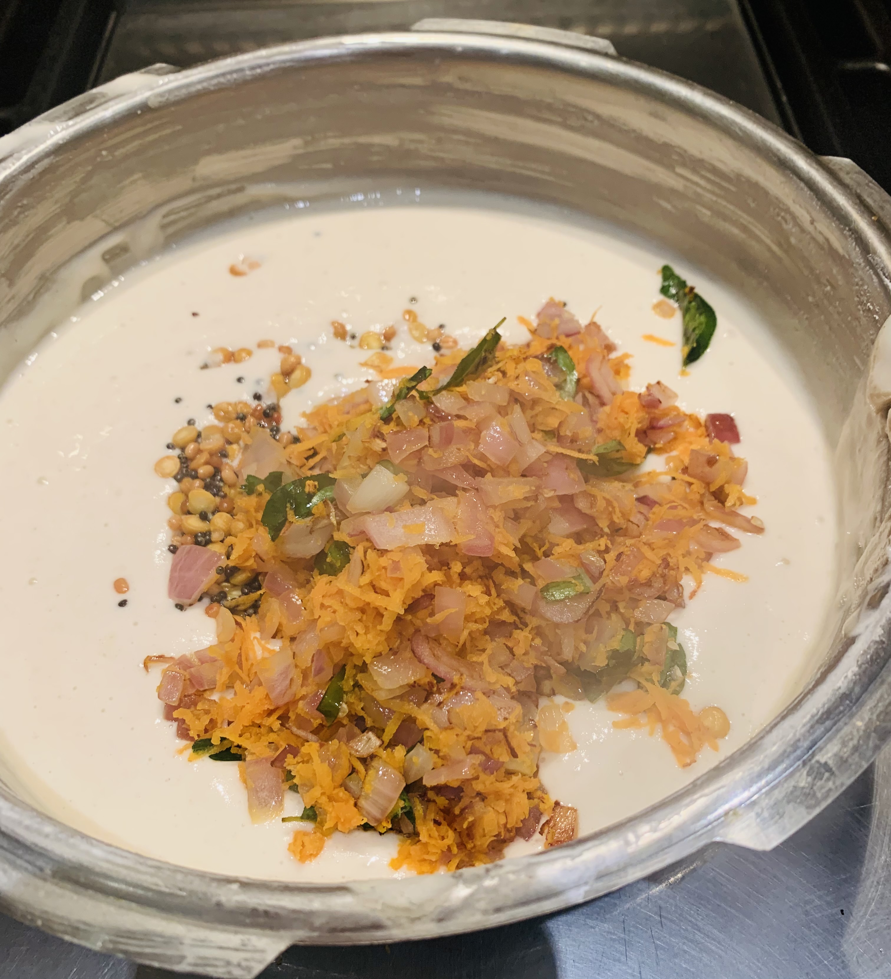 • It is optional to add onion and veggies to the batter. The batter can be seasoned just with mustard seeds, urad dhal, channa dhal and green chillies.