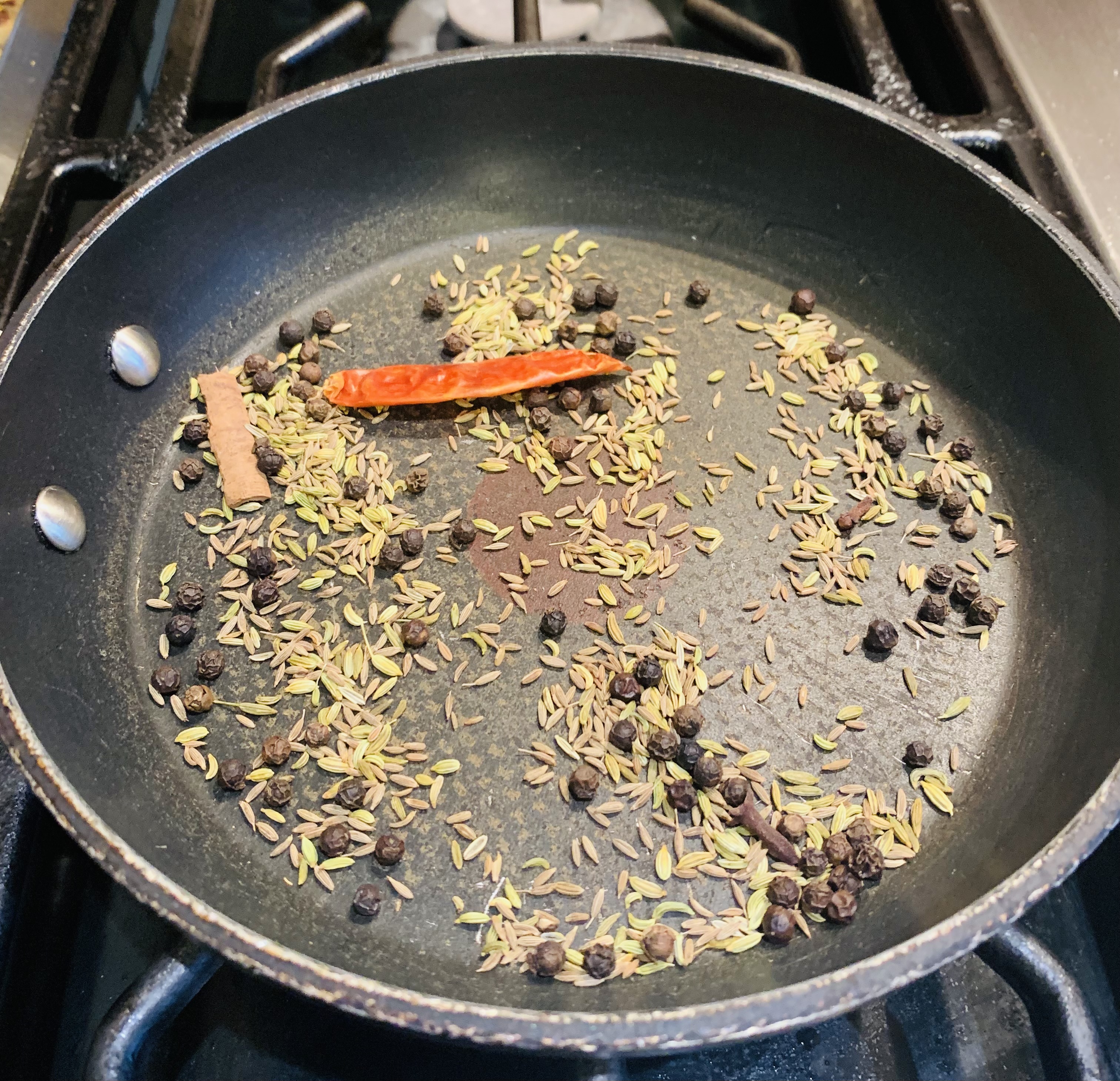 - To make pepper masala – Heat a pan and add 11/2 teaspoon peppercorns, 1 teaspoon cumin seeds, 1 teaspoon fennel seeds, 1 red chilli, 1-2 cloves and a small piece cinnamon. Dry roast the spices in medium flame for 1 to 2 minutes or until it leaves a good aroma. Transfer to a plate and allow it to cool. Grind the roasted spices to a powder. Let the consistency of the powder be in between that of coarse and fine.