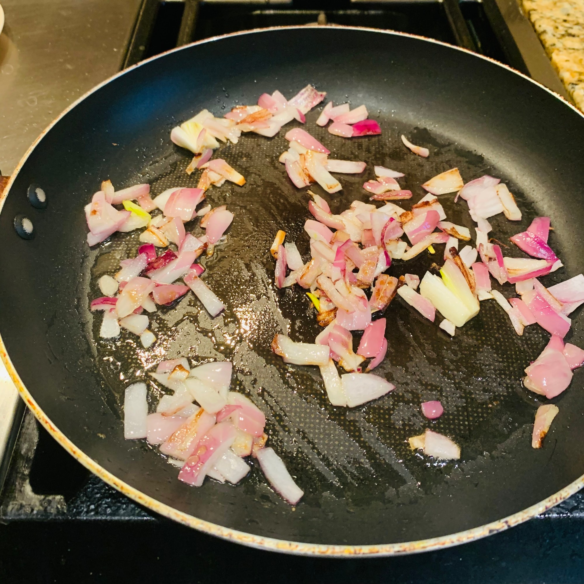 - Heat a pan and add 2 tablespoon oil. When the oil is warm enough, add the chopped onion. Saute` the onion until it is transparent. Add the crushed ginger / garlic and saute` until the raw smell goes away.
