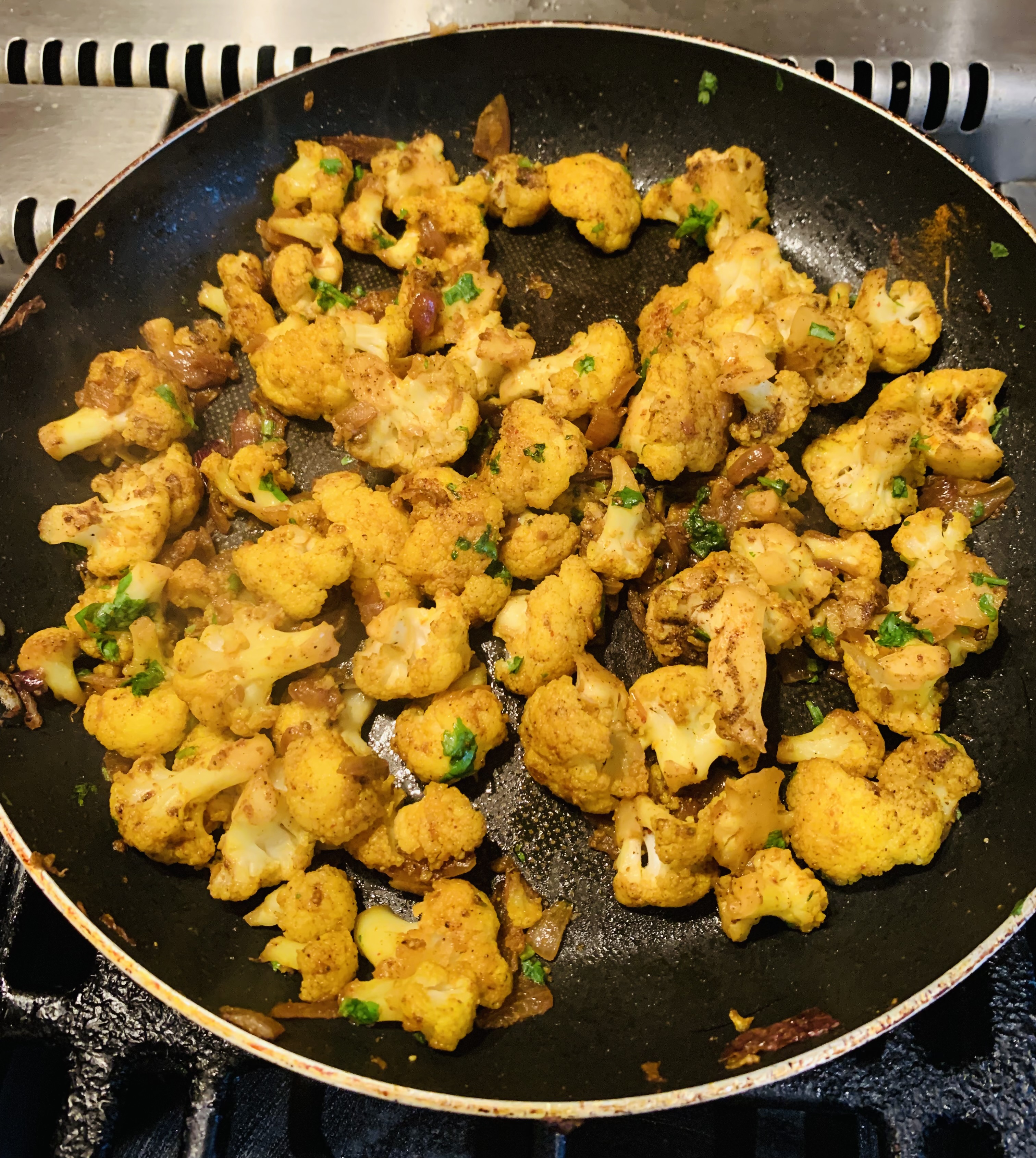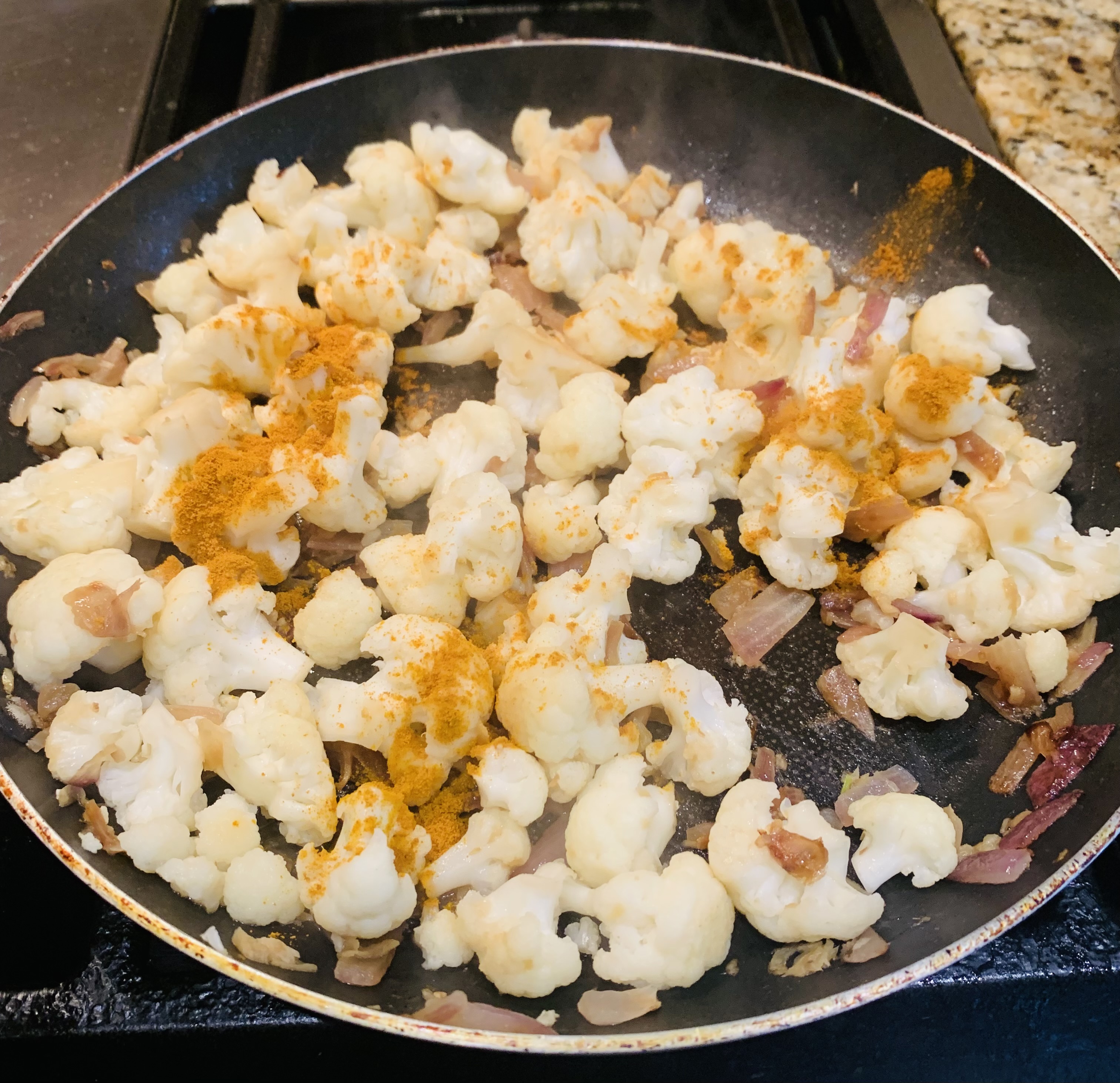 - Add 1/2 teaspoon turmeric powder and salt to taste. Mix the contents well. At this stage, if the pan is dry, then add more oil ( 1 tablespoon). Cook in low flame until the cauliflower florets are slightly golden brown. If you prefer the cauliflower to be crispier, then add more oil. Instead of oil, you can also substitute butter.